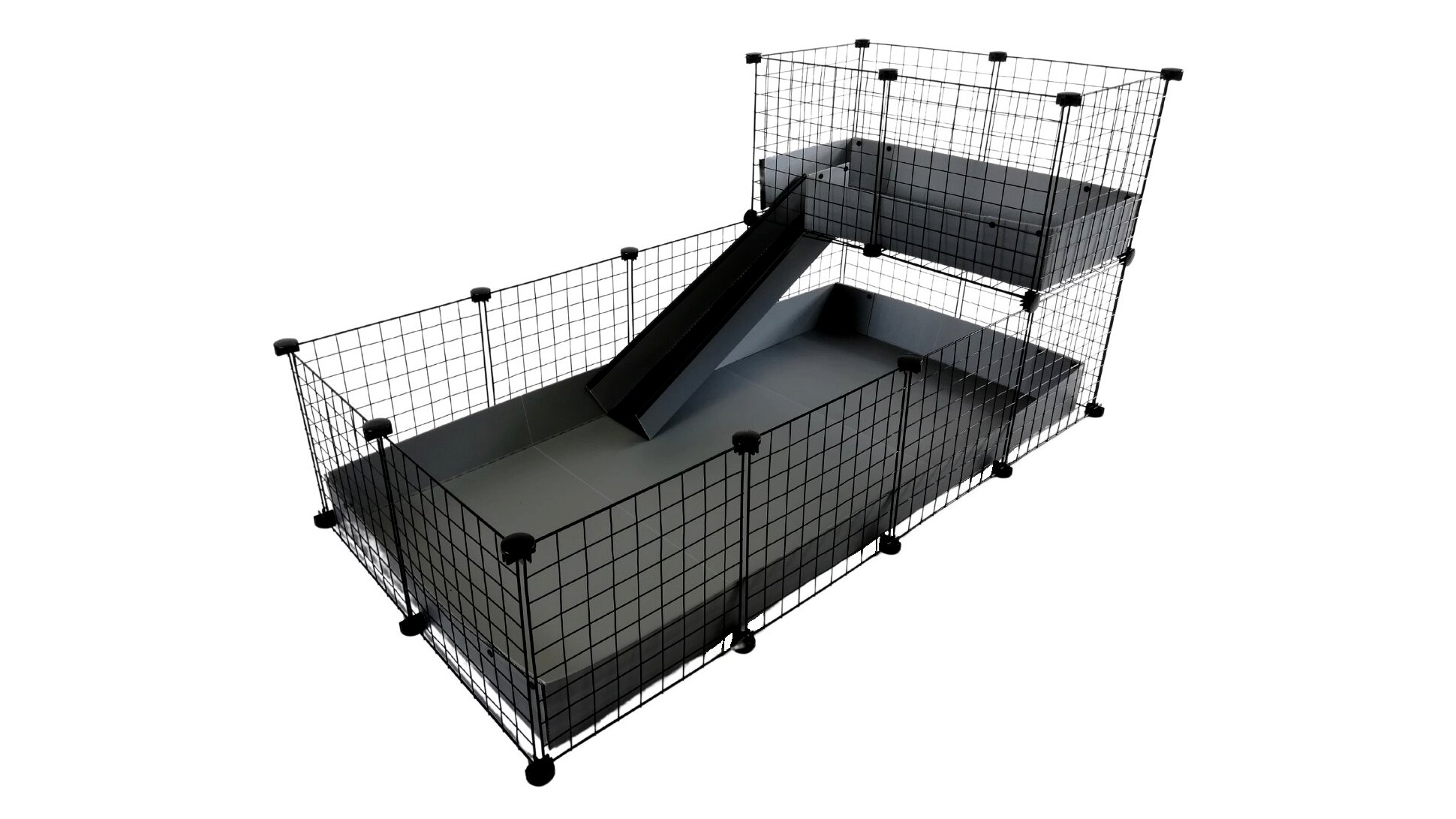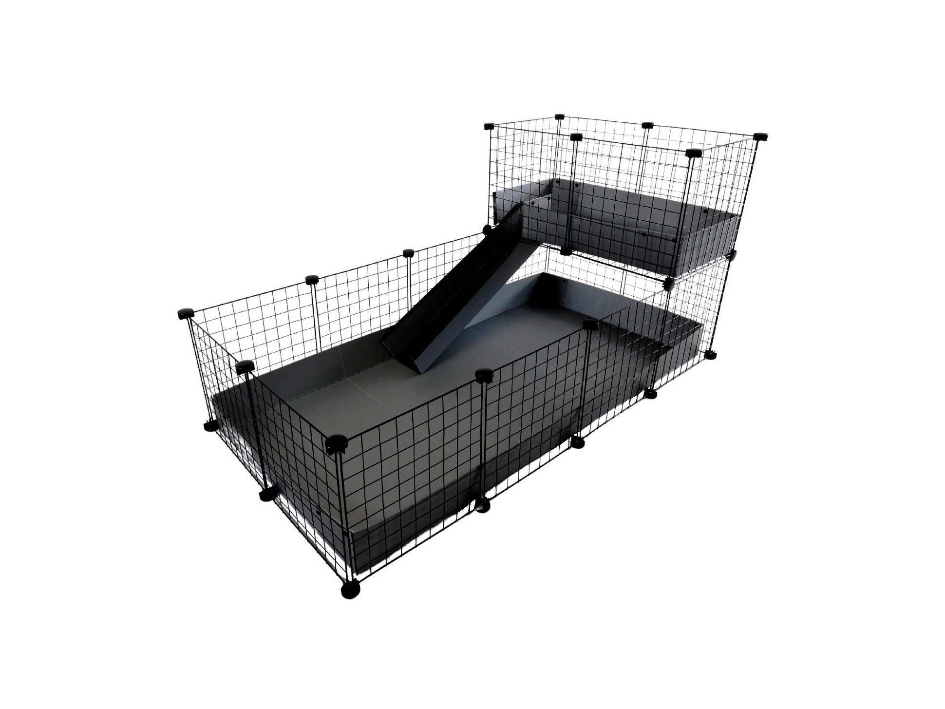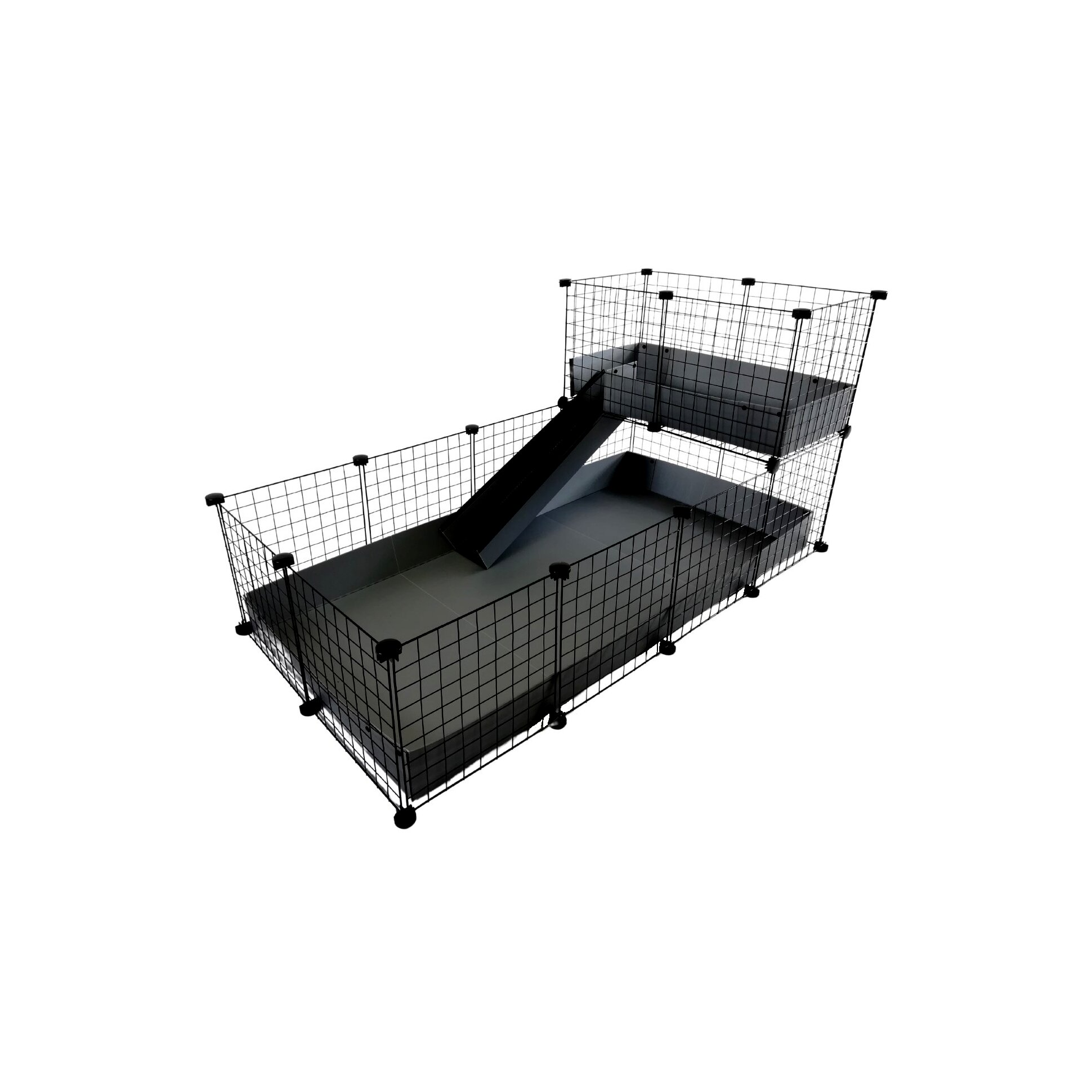 - Moduláris kialakítás: A ketrec 4x2 fő részből és 2x1 loftból áll, szürke rámpával kiegészítve.