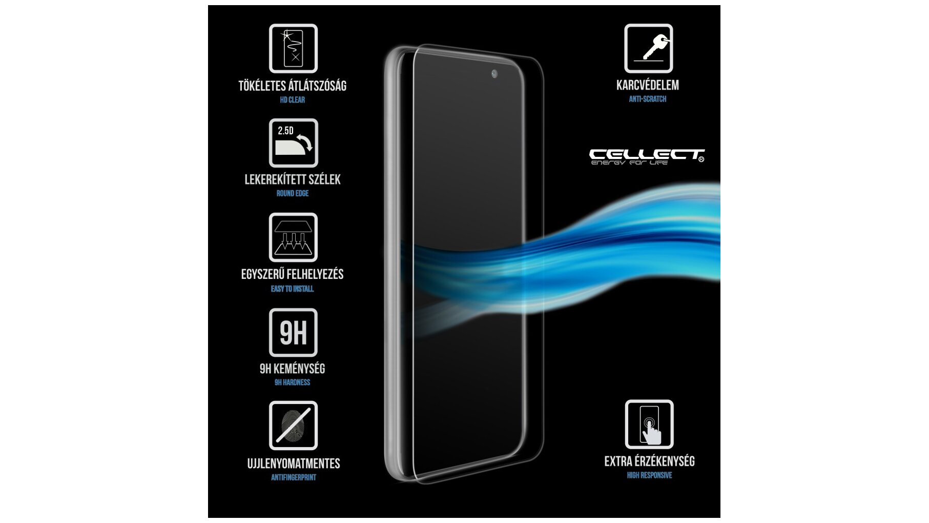 Védd meg telefonod kijelzőjét a Cellect üvegfóliájával. Az edzett üveg kialakítás rendkívül ellenállóvá teszi az ütések és karcolások ellen. A speciális technológiával készült ragasztó rétegnek köszönhetően könnyedén és buborékmentesen felhelyezhető ellentétben a legtöbb védőfóliával.