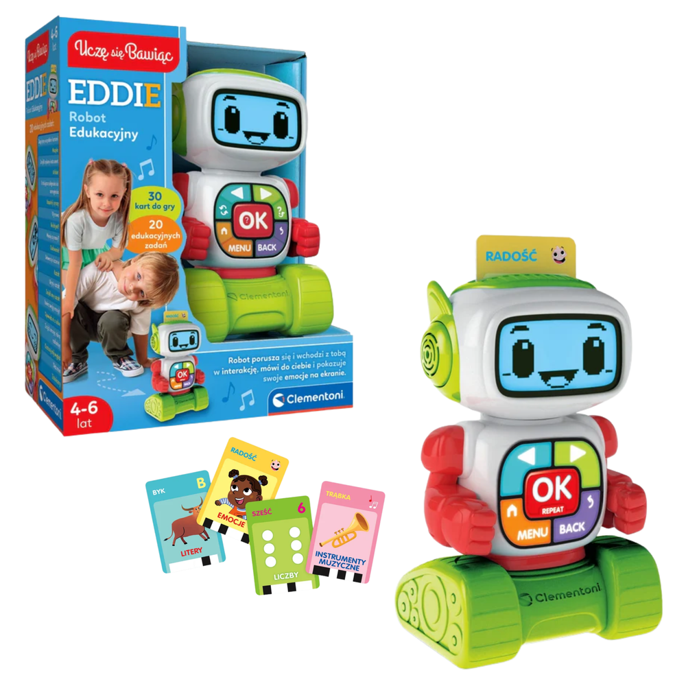 A barátságos, érzelmeket megjelenítő kis robot különleges oktatójáték, amely játékos formában vezeti be a gyerekeket a lengyel nyelv világába. Mozgó, animált „arca”, beszéde és interaktív feladatai egyszerre szórakoztatnak és fejlesztik a kicsik logikus gondolkodását, figyelmét és megfigyelőképességét.