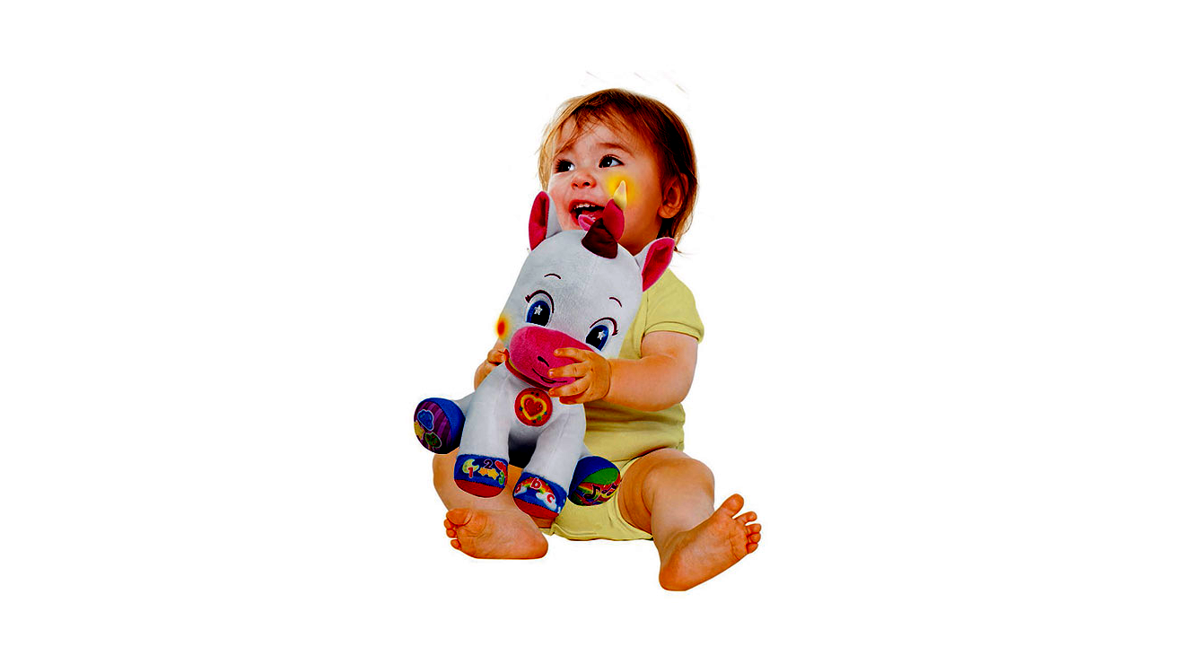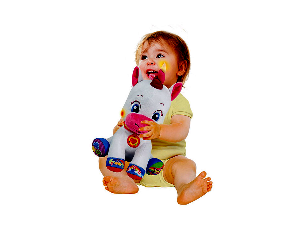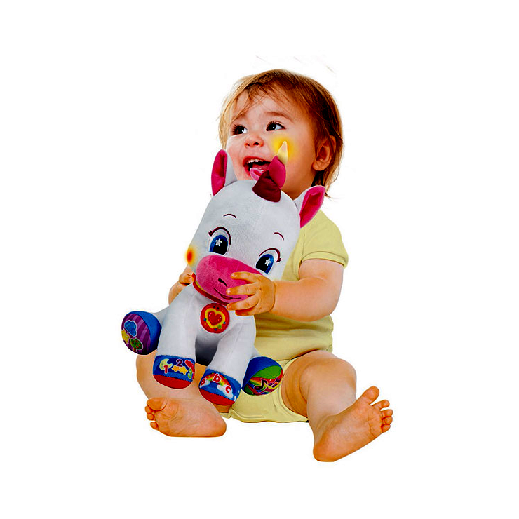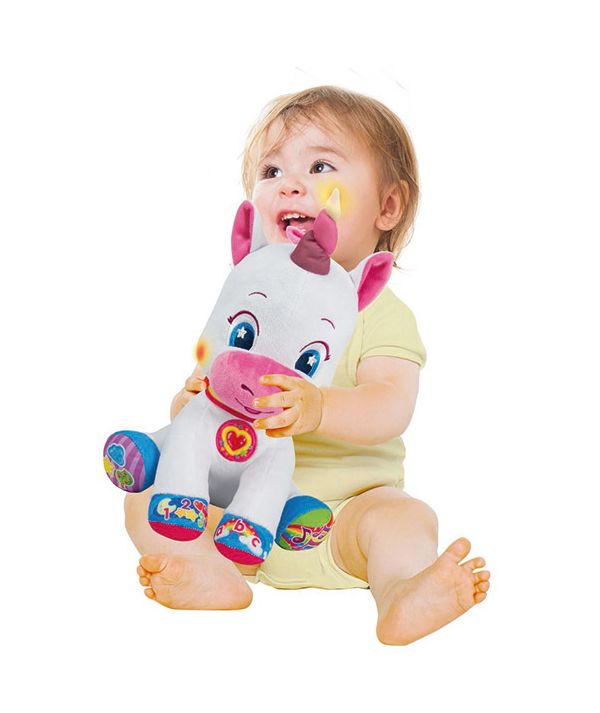 A Clementoni interaktív plüss unikornis varázslatos kalandozásra hívja a gyerkőcöket! A pihe-puha egyszarvú bevezeti őket a színek, alakzatok, betűk és számok világába, ráadásul fény- és hanghatásokkal teszi mindezt még izgalmasabbá. Fejlesztő tulajdonságokkal is rendelkezik, hiszen játék közben fejlődnek a nyelvi készségek, valamint serkenti a hallást és a látást is. 6 hónapos kortól ajánljuk. A játék tartalmazza az elemeket. Méretek: 26 x 18 x 32 cm.