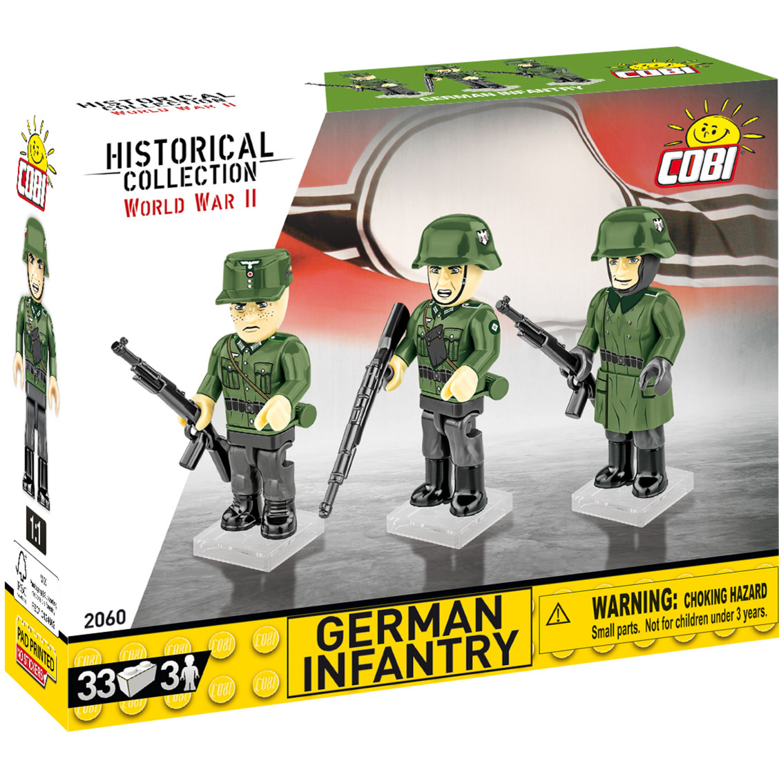 A második világháború során a gyalogság képezte a hadseregek gerincét, így különösen fontos szerepet játszott a városok elfoglalásában, a frontvonalak tartásában és a harctéri műveletek végrehajtásában. Ez a készlet két német gyalogost és egy hegyi gyalogost jelenít meg, akik a korszak ikonikus Mauser Kar98k puskáival vannak felszerelve. Az egyenruhák színezése, a rangjelzések és a fegyverek megformálása a történelmi hűségre törekszik, ezáltal a készlet jól illeszkedik diorámákhoz, makettekhez, terepasztalokhoz is.