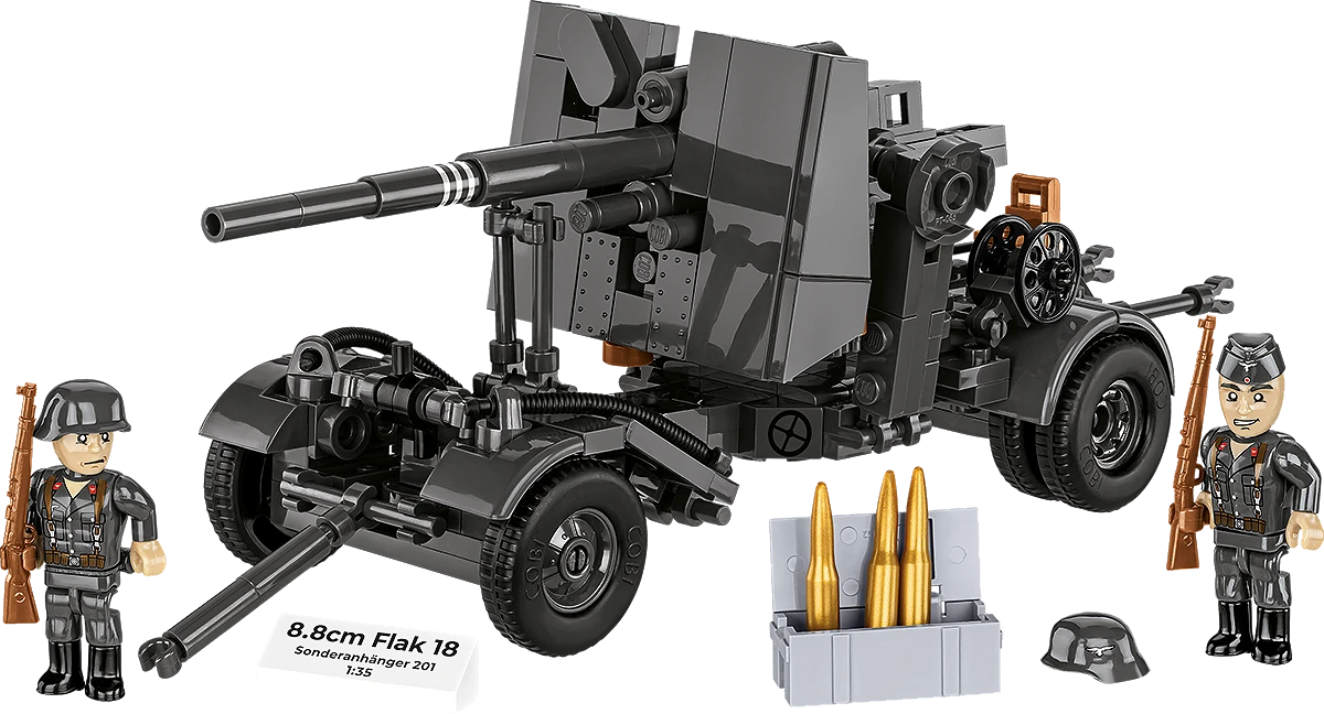 A 8,8 cm-es Flak 18 klasszikus változata utánfutóval különleges élményt nyújt mind a katonai témák kedvelőinek, mind a modellgyűjtőknek. A részletesen kidolgozott ágyú a jellegzetes kereszt alakú állványra szerelhető, vagy a Sonderanhänger 201 utánfutón szállítható, így tökéletesen illeszthető diorámákba, csatajelenetekbe.