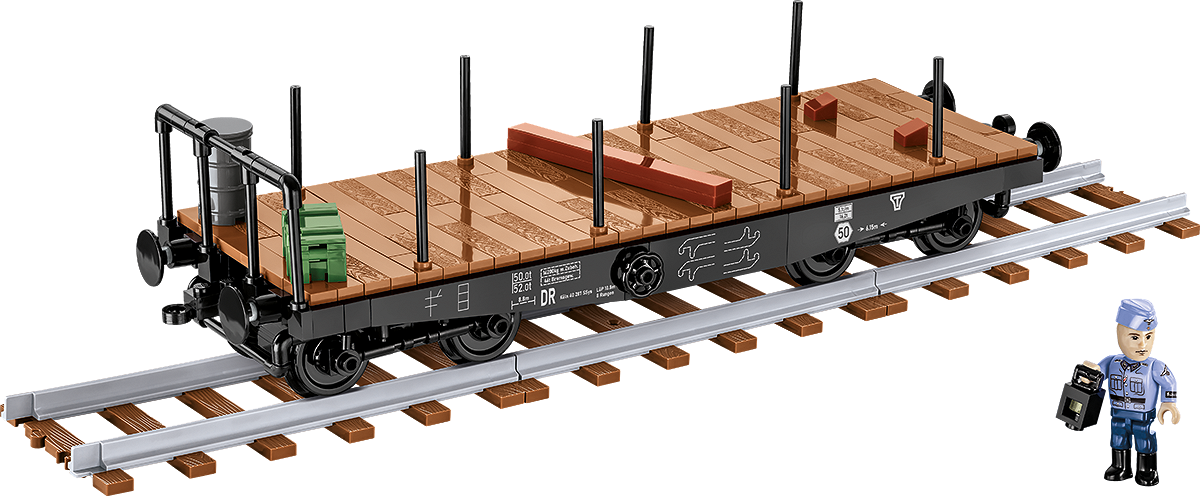 Ez a német nehéz platformos kocsiról mintázott COBI modell a II. világháború idejéből, 1:35 méretarányban készült. Az építőjáték lehetővé teszi, hogy járműveket és tankokat szállítsunk ugyanabból a szériából és méretarányból. Az élmény tovább fokozható, mivel a platformkocsi különböző COBI vasúti gyűjteménybe tartozó mozdonyokkal is összeilleszthető. A modell részletes nyomtatásokkal és kormányozható kerekekkel van ellátva, és a készlet része egy vasúti őr figura lámpával, valamint három egyenes sín szakasz.