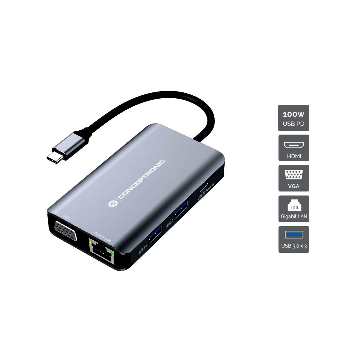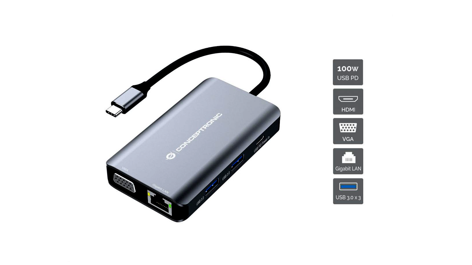 - 7 az 1-ben USB-C - HDMI/VGA/USB-C PD/USB 3.0/GbE többportos adapter