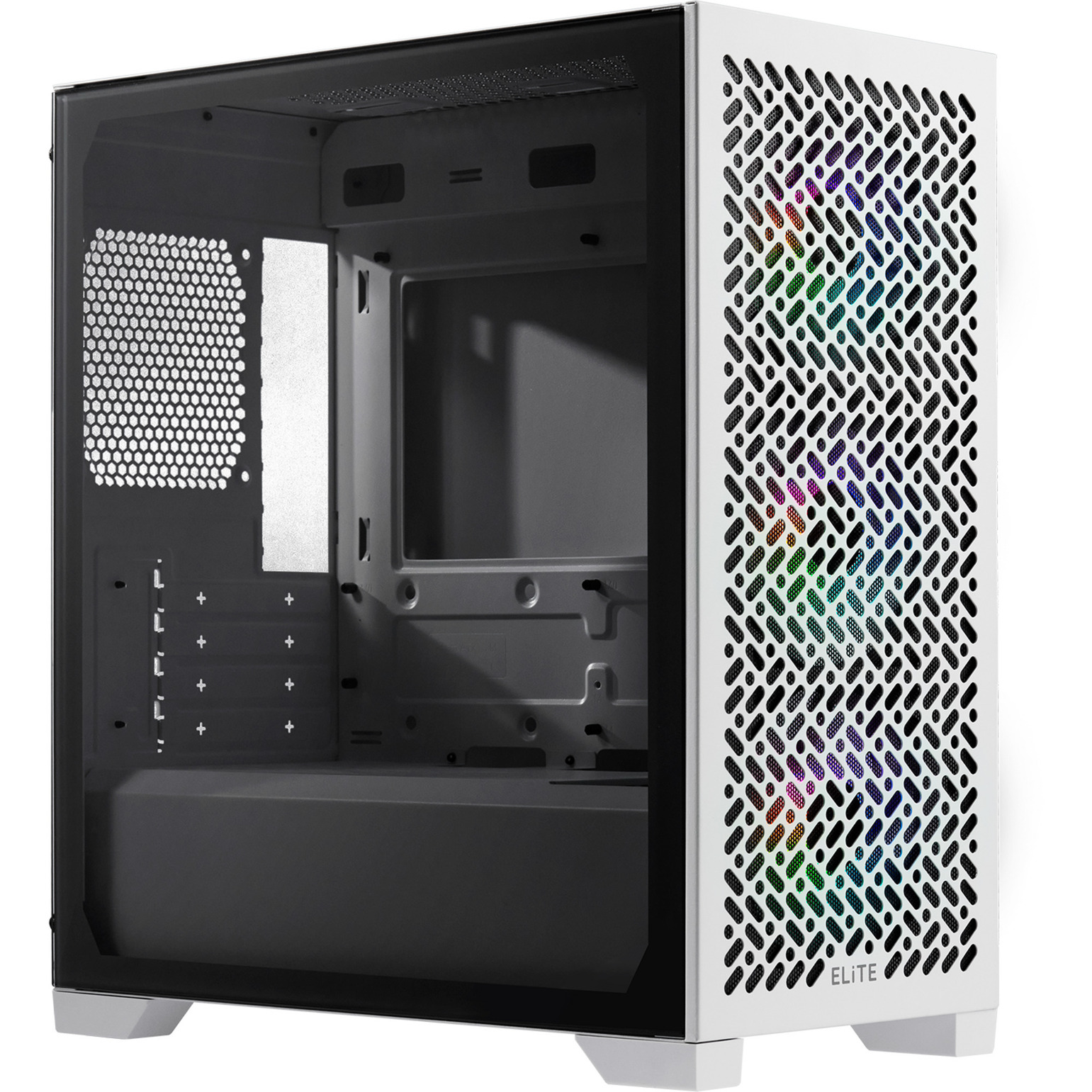 A ház minimalista, fehér színvilága és az edzett üveg oldallap kifejezetten a látványos, RGB-s konfigurációkhoz készült. A teljesen fekete belső tér a színes világítást még hangsúlyosabbá teszi, a tápegység takarólemez pedig elrejti a kábeleket és a kevésbé dekoratív elemeket, így a gép összképe mindig rendezett és professzionális marad.