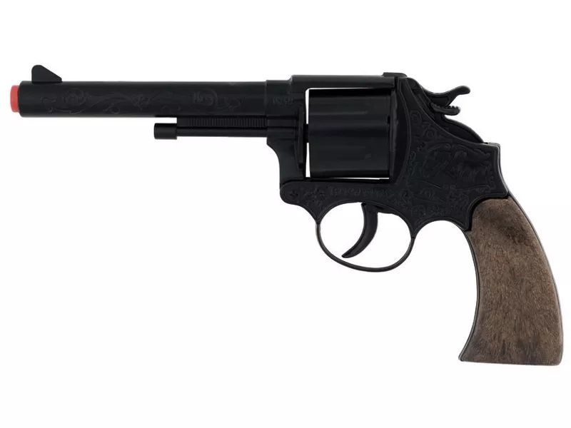 Cowboy jelmezekhez használható fém revolver! A patronos pisztoly egy elegáns, keskenyebb kivitelű forgótáras fegyver, amit 8 darabos rózsapatronnal tudsz megtölteni. A pisztoly fémből és műanyagból készült, a töltött pisztolyt érdemes kültéren használni, mert hangosan tud pukkanni. A csomagolás a patront nem, csak a fegyvert tartalmazza.