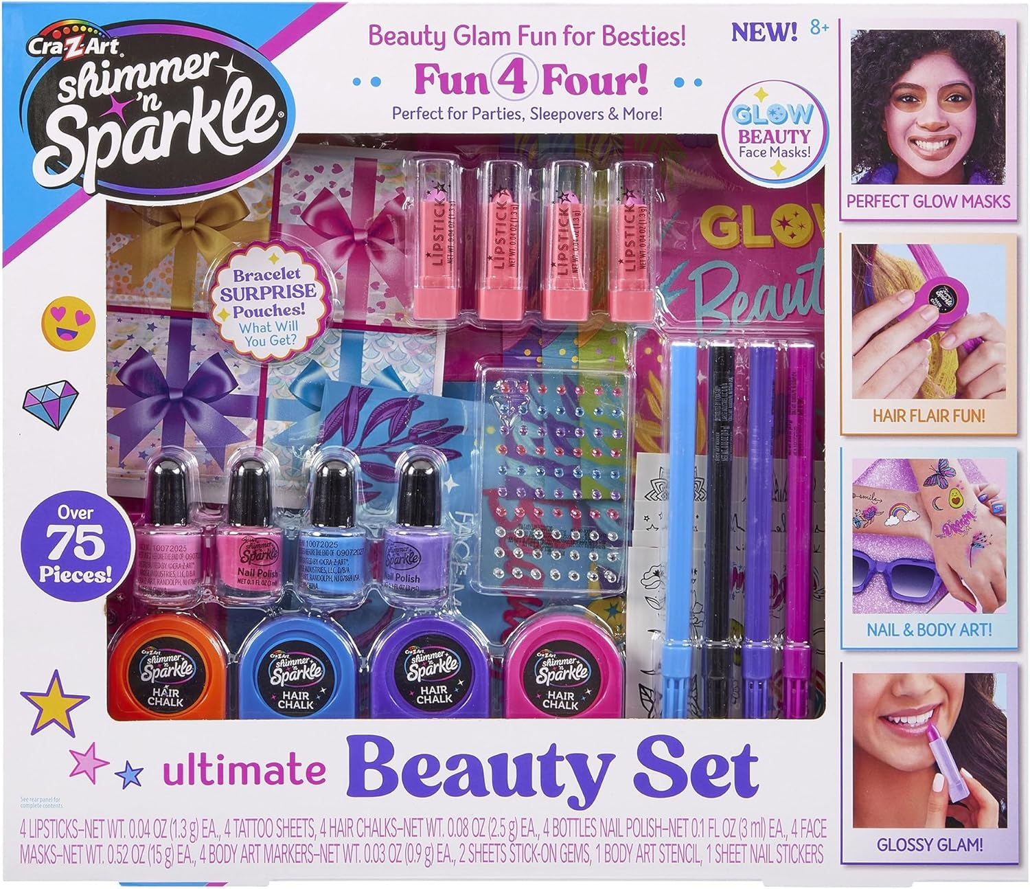 A Cra-Z-Art Shimmer 'n Sparkle 75 részes Ultimate Beauty szett egy színes, vidám és játékos szépségápolási készlet, amellyel a gyerekek biztonságos keretek között próbálhatják ki a sminkelés és a szépségápolás világát. Ideális baráti összejövetelekhez, kreatív szerepjátékokhoz, valamint az önkifejezés és az egyéni stílus felfedezéséhez.