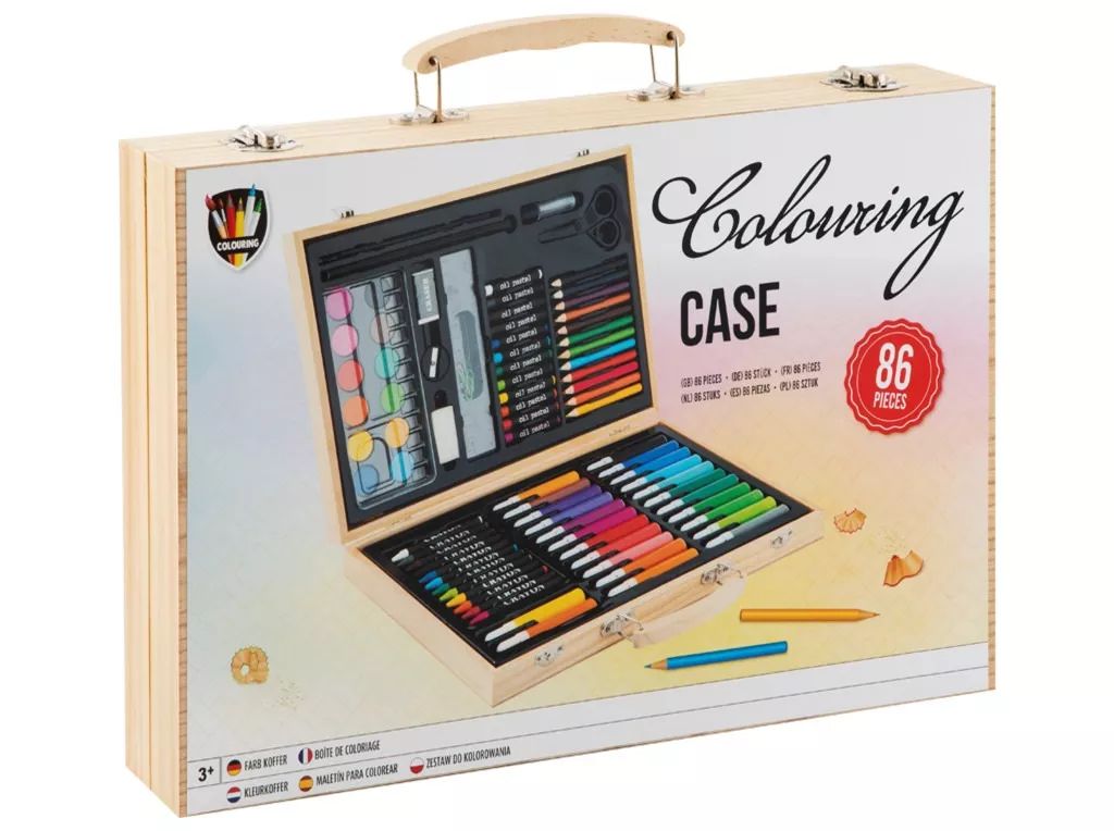- Tartalom: 86 db rajzeszköz - filctollak, zsírkréták, festékek, ceruzák, olló, vonalzó, ceruzahegyező és egyéb kiegészítők, fa bőrönd fogantyúval