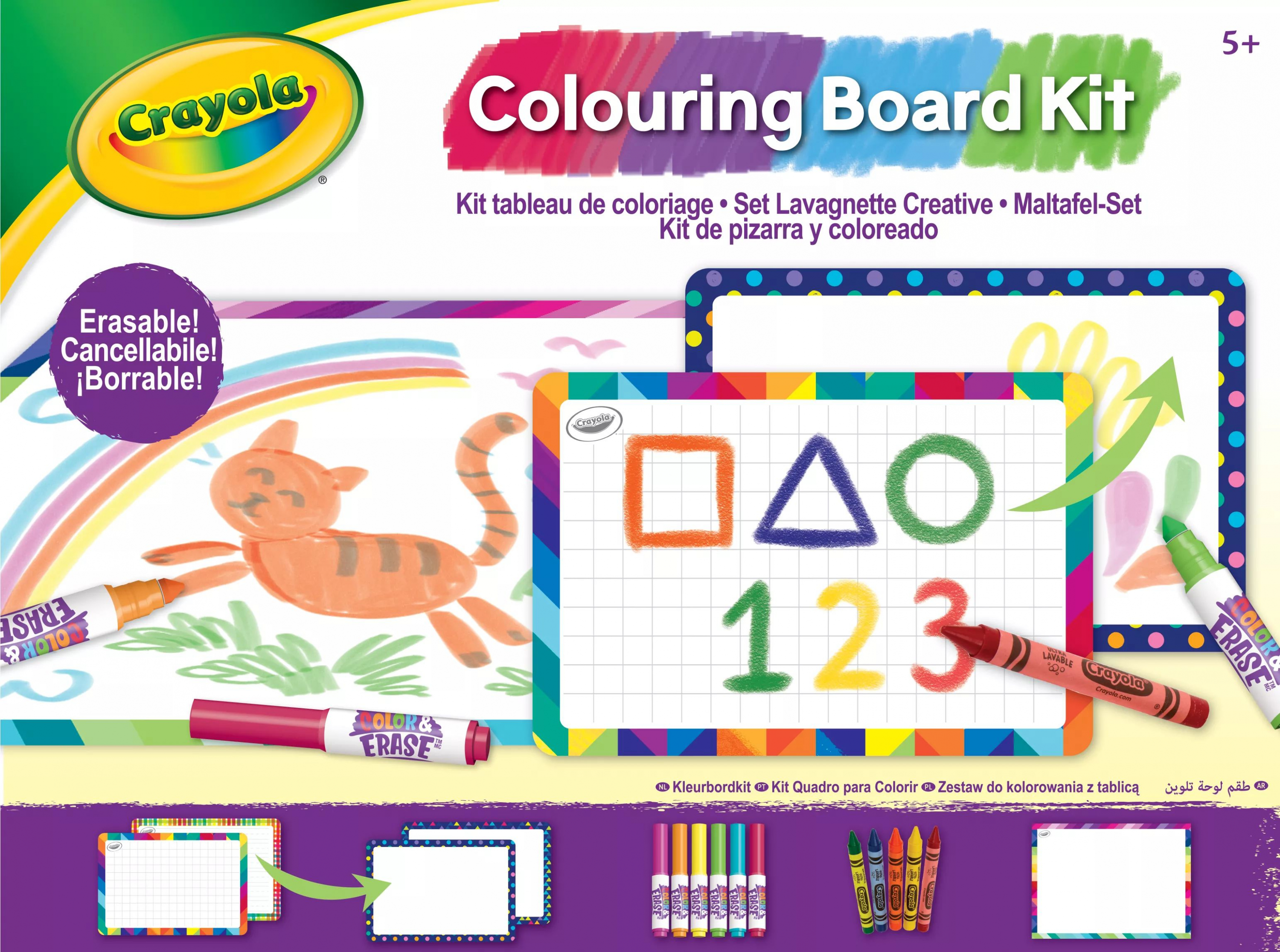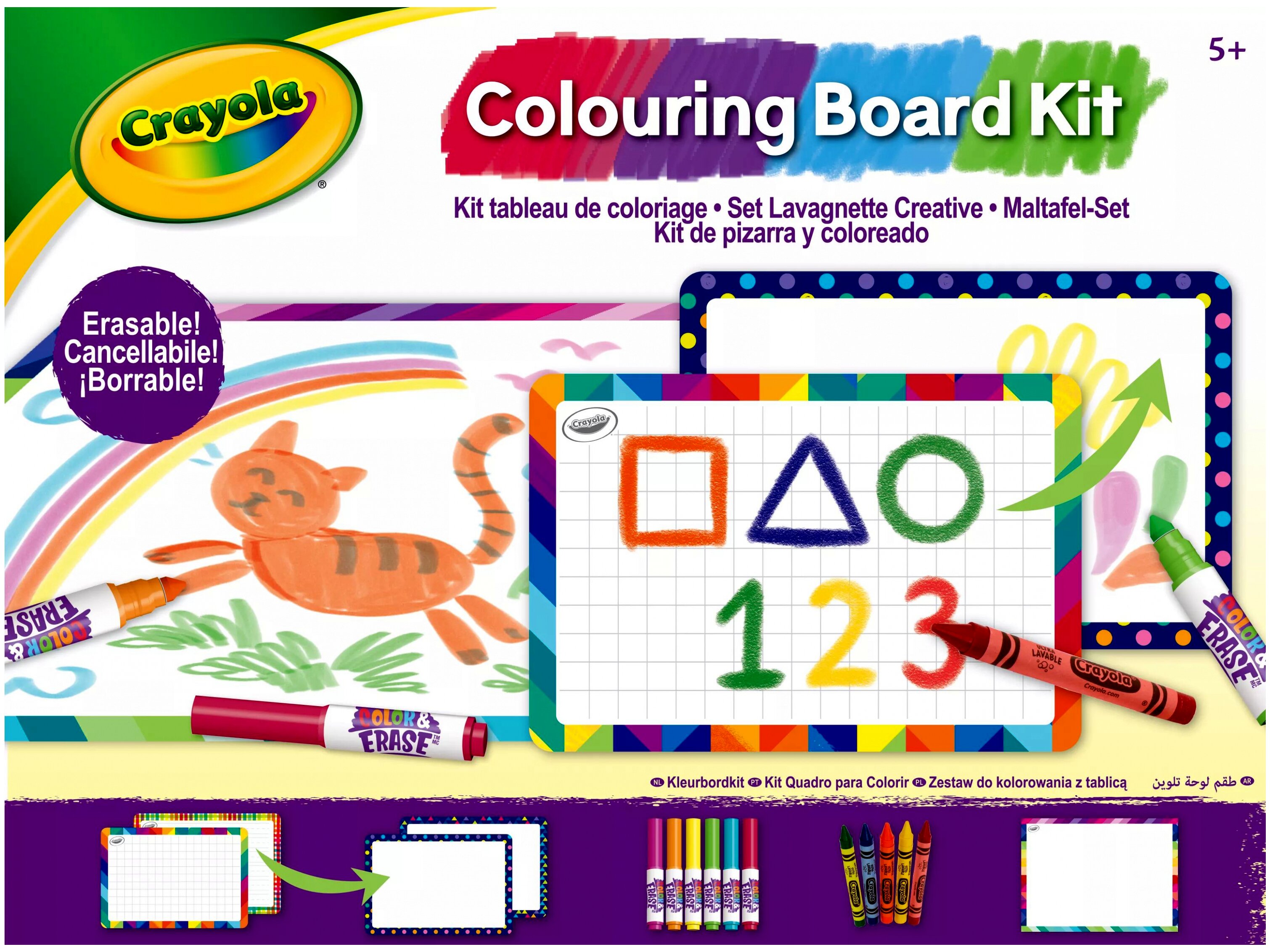 A Crayola rajztábla szett tartalma: 6 darab élénk színű filctoll, valamint 5 darab könnyen használható zsírkréta, amelyek mind könnyen kimoshatóak textíliákból, így a foltok miatt sem kell aggódnod. A rajztábla cserélhető lapjai biztosítják, hogy mindig újabb és újabb felületen alkothasson gyermeked.