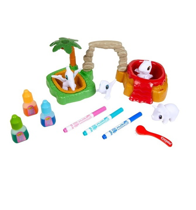 A Crayola Washimals Dínósziget játékszett 4 db aranyos dinoszauruszt rejt, melyeket a gyerekek szabadon színezhetnek és firkálhatnak, újra és újra! Ha elkészült az alkotás, elég csak lemosni az imádni való dínókat és kezdődhet elölről a móka! A mintáknak csak a képzelet szabhat határt. A szett a 4 db figura mellett 3 db filctollat és kiegészítőket is tartalmaz. Csomagolás mérete: 12 x 24 x 33 cm.