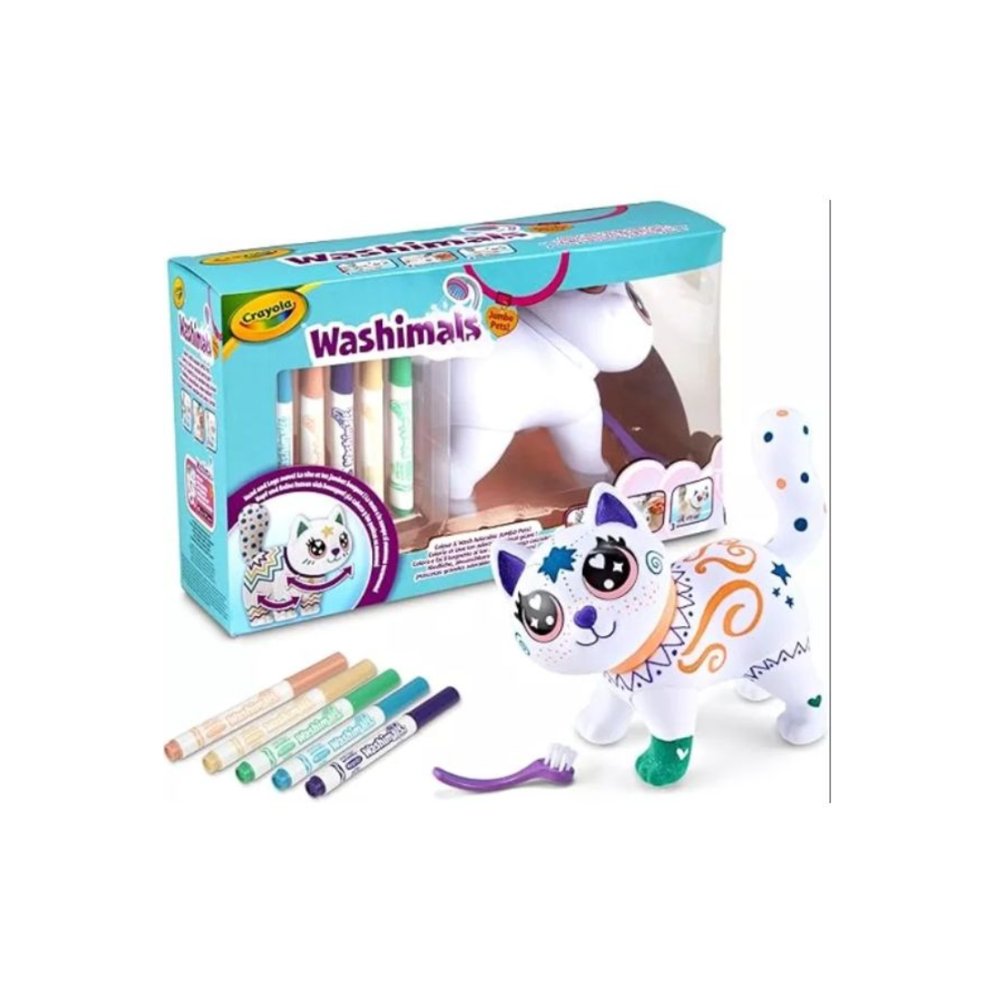 A Crayola Washimals mozgatható óriás kiskedvenc szettjében egy imádnivaló cica várja, hogy a gyerekek új színt adjanak kültakarójának. A kicsik szabadon színezhetik, firkálhatják és dekorálhatják a figurát a csomagban rejlő 5 különböző színű filctollal.