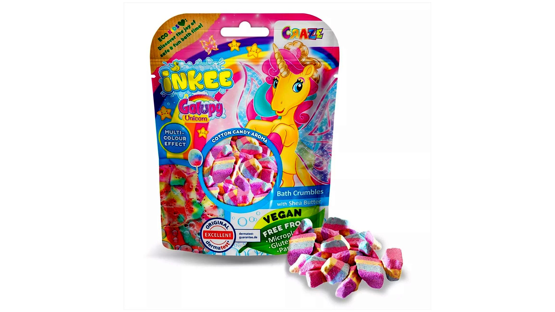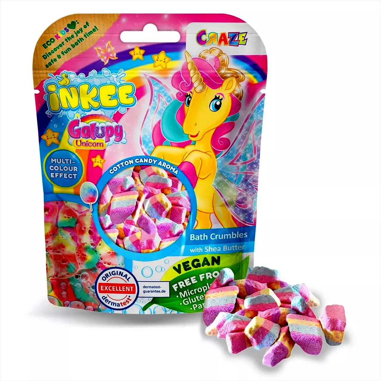 Varázsold különlegessé a fürdőidőt a Craze Inkee Galupy unikornis fürdőkristály segítségével! A vattacukor illatú, szivárvány színű kristályok nemcsak látványosak, hanem ápolják is a bőrt.