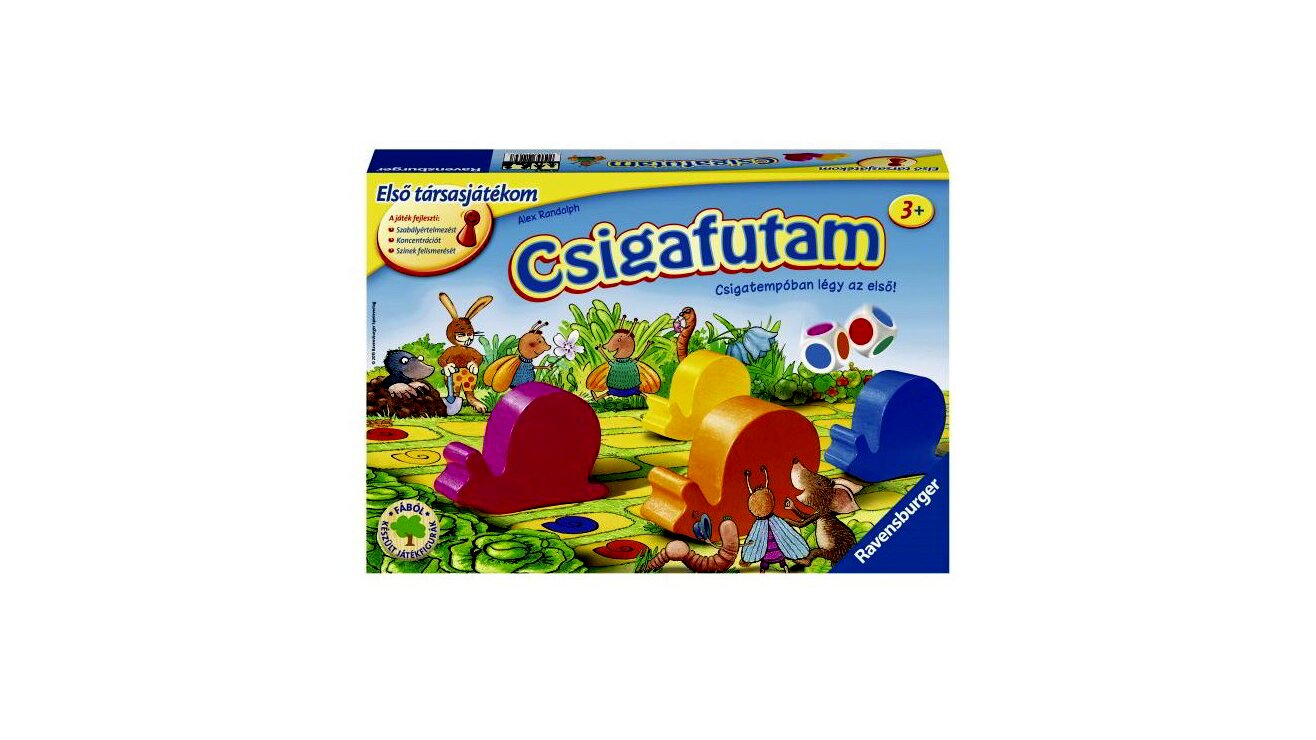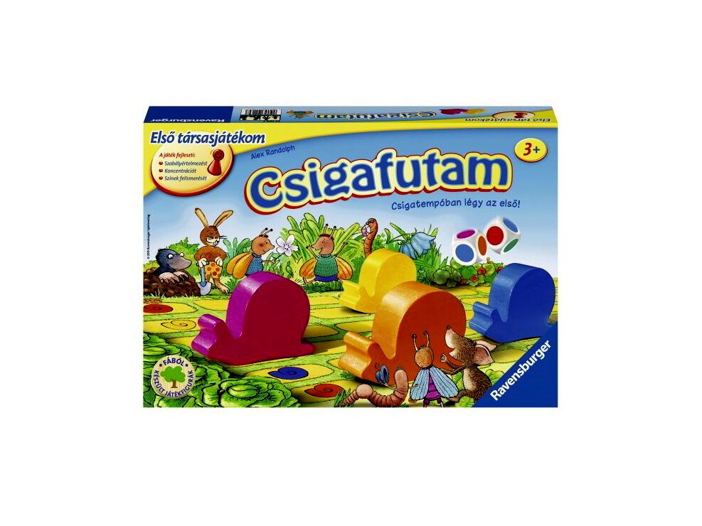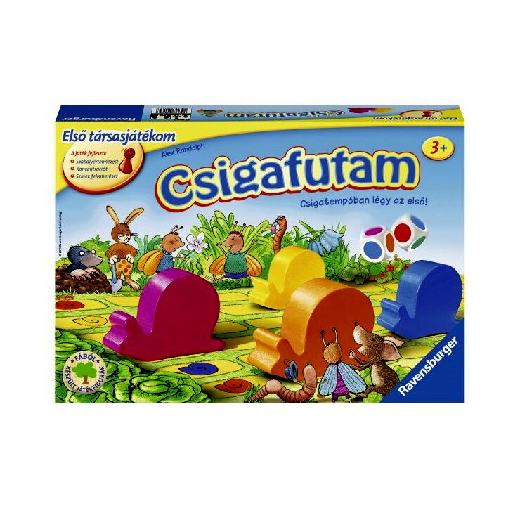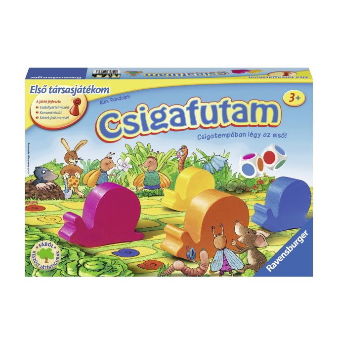 Csigatempóban legyél az első! Hat színes kerti csiga áll készen a versenyzésre. Melyikül lesz az első, vagy akár az utolsó? A Csigafutam társasjáték óvodásoknak készült, és megegyezés szerint az nyeri a játékot, aki elsőként, vagy épp utolsóként jut el a célba! A bábuk fából készültek.