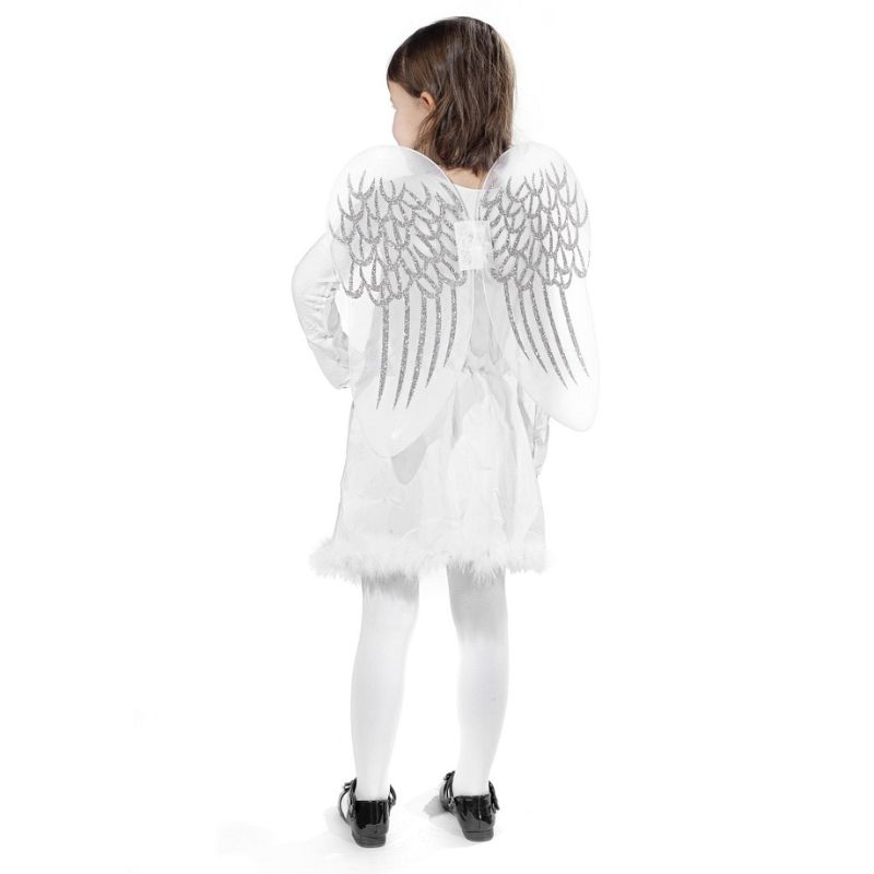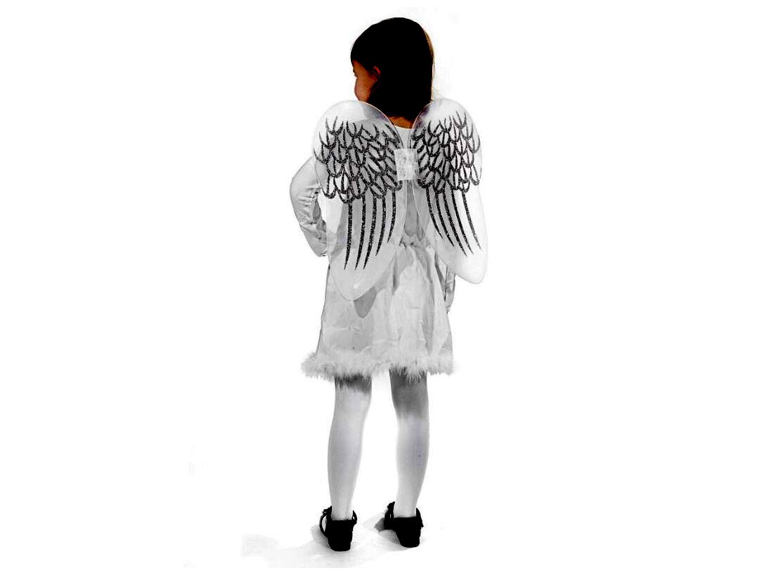 Csillogó angyal szárnyak betlehemezéshez. Áttetsző anyagból készült, ezüst csillámmal díszített, rugalmas szalaggal rögzíthető.