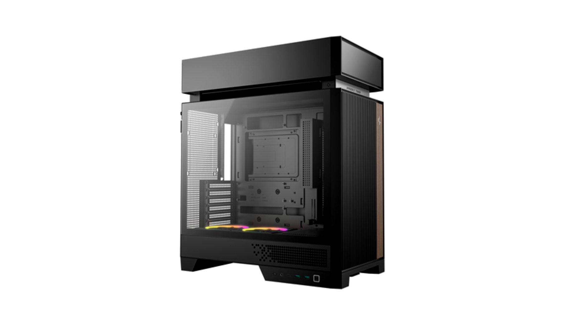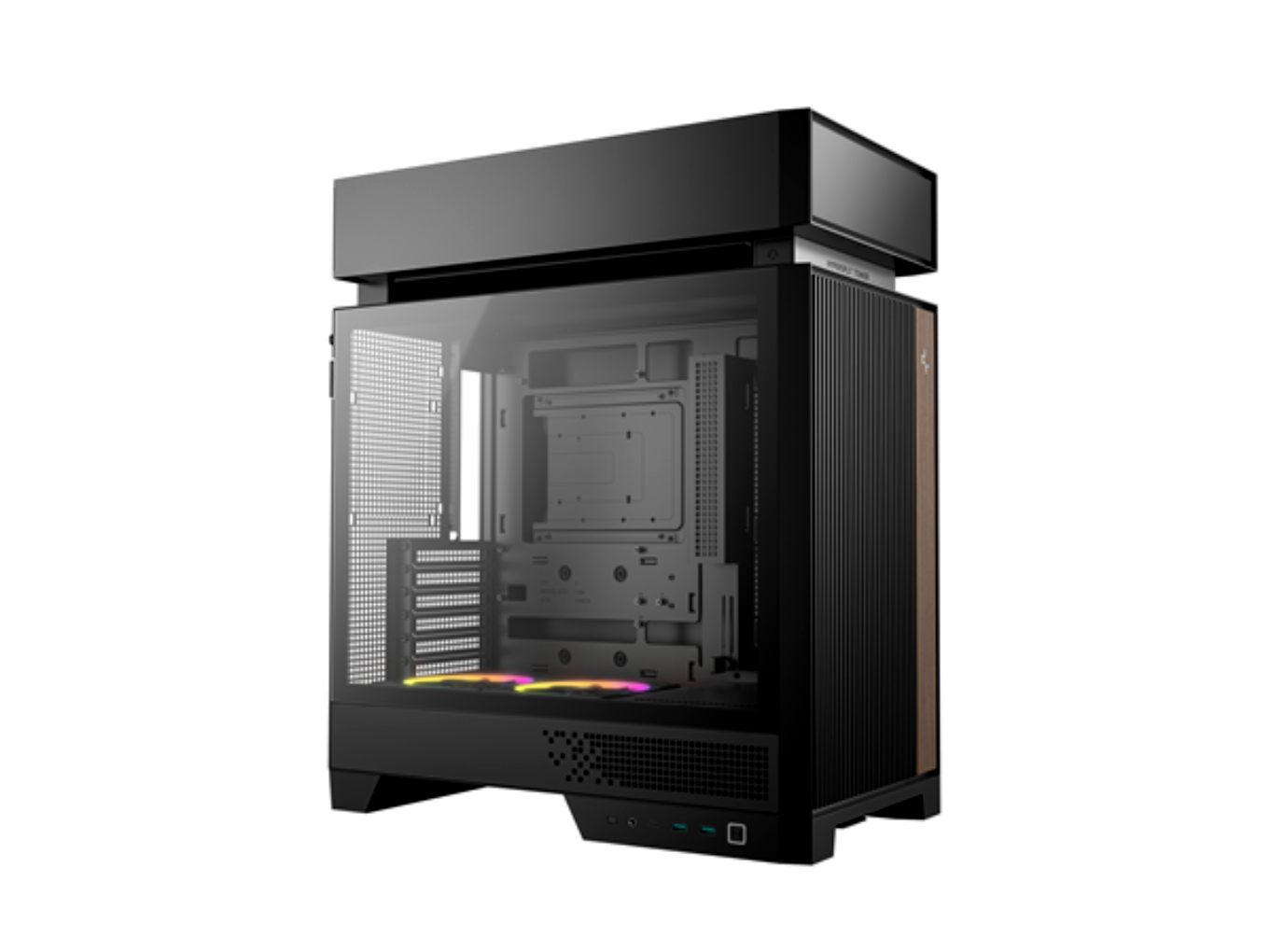 A ház kialakítása a friss levegő hatékony bevezetésére és az optimális hőelvezetésre fókuszál. Az alul elhelyezett, gyárilag beépített 120 mm-es A-RGB ventilátorok fordított lapátkialakítással dolgoznak, így alulról felfelé irányított, tiszta és egyenletes légáramlást biztosítanak a videokártya és az alsó komponensek számára. Felül akár egy 360 mm-es radiátor is elhelyezhető, ami különösen kedvező vízhűtéses rendszerekhez és nagy teljesítményű processzorokhoz.