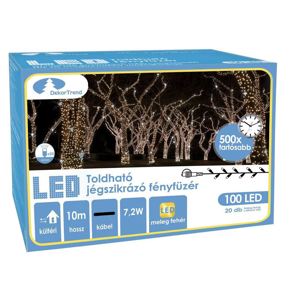 A fényfüzéren 100 db LED izzó található, amelyek közül 80 darab meleg fehér, 20 darab pedig villogó hideg fehér színű. Ez a kombináció jégszikrázó hatást kölcsönöz, amely meghitt és varázslatos fényt ad bármely helyiségnek vagy külső térnek.