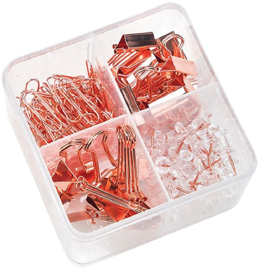 Fedezd fel a rosegold színű asztali szögletes kiegészítő készletet, amely igazi ékköve lehet irodádnak! Ez a 171 darabos szett elegáns megjelenésével és praktikus összeállításával tökéletes választás mindenkinek, aki kedveli az egyedi és stílusos irodai eszközöket.