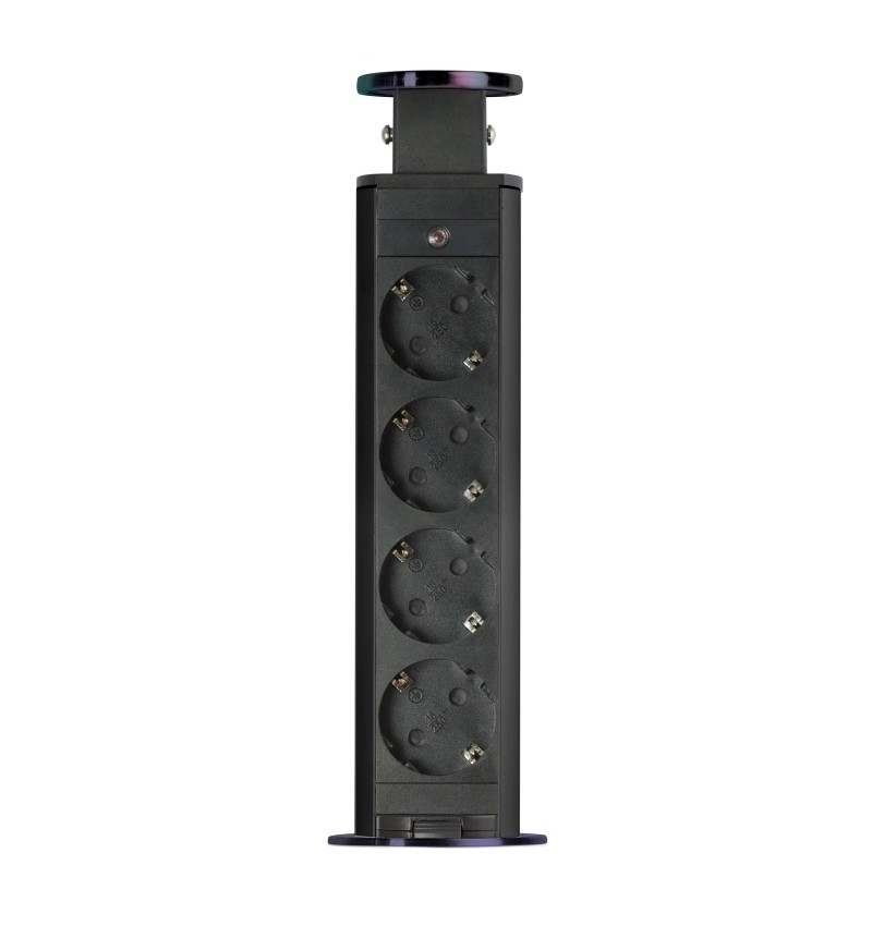 Süllyeszthető elosztó irodai és otthoni felhasználásra, fém házzal, 4 db gyermekvédelemmel ellátott aljzattal. Asztala, bútora legyen mindig elegáns és rendezett, mégis funkcionális. A rejtett elosztó kiváló megoldás lehet ha már például kész konyhával rendelkezik, de nincs elegendő konnektor a kívánt helyen. Ilyenkor falvésés és villamos hálózat bővítés nélkül remek alternatíva lehet egy rejtett elosztó. Egy mozdulat és máris rendelkezésre áll 4 szabad konnektor. Ideális lehet olyan elektromos eszközökhöz, amiket nem folyamatosan használunk, pl. kenyérpirító, vízforraló stb. Ha nem használjuk, a "töltőoszlop" egy mozdulattal elrejthető, ezzel is megkönnyítve például a takarítást, valamint rendezett, letisztult külsőt ad a helységnek.