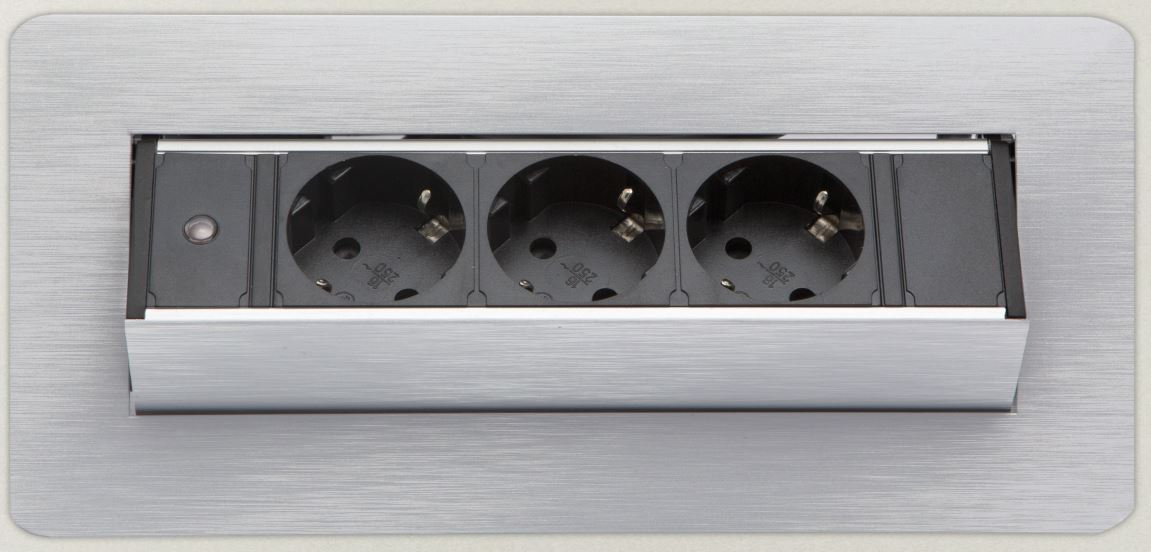 Süllyeszthető elosztó irodai és otthoni felhasználásra, szálcsiszolt felülettel, 3 db gyermekvédelemmel ellátott aljzattal. Asztala, bútora legyen mindig elegáns és rendezett, mégis funkcionális.