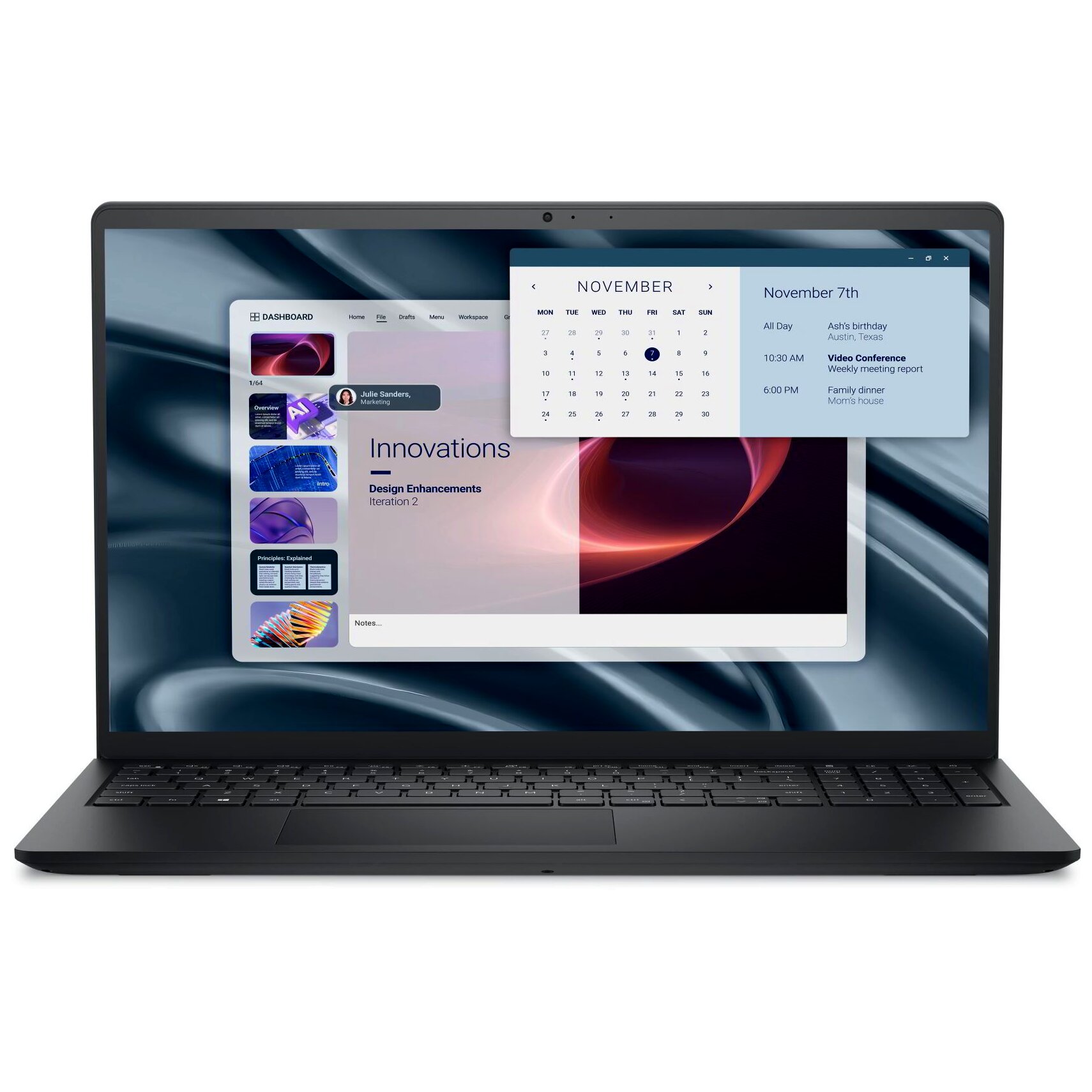 A Carbon Black színvilág elegáns, nem feltűnő, üzleti környezetben is kifejezetten professzionális megjelenést biztosít. A matt kijelző és a visszafogott vonalvezetés klasszikus Dell üzleti stílust tükröz.