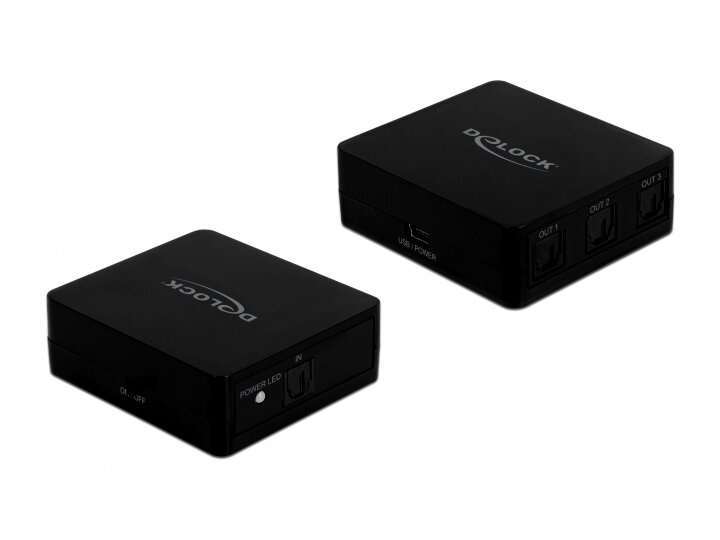 Bemenet: 1 x TOSLINK hüvely S/PDIF, 1 x USB Mini-B típusú hüvely (5 V tápellátás). Kimenet: 3 x TOSLINK hüvely S/PDIF.