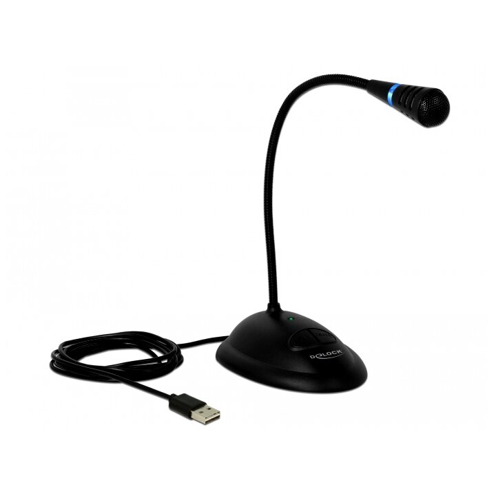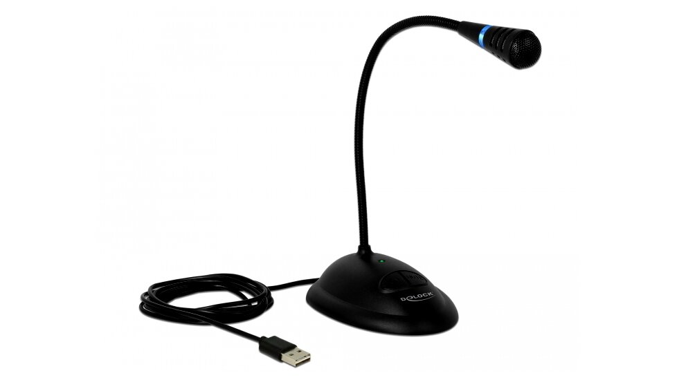 Ez a Delock USB mikrofon hang- és dallam küldésére használható. A gumírozott alap biztosítja a csúszásmentes talapzatot, és a gégecső lehetővé teszi a mikrofon ideális irányba történő beállítását. A LED gyűrű és a zöld LED fény jelzi a működésre kész állapotot, az elnémítás bekapcsolását vagy kikapcsolását a kék illetve piros fény mutatja. Az Elnémító (Mute) gomb teszi némává a mikrofont és a Bekapcsoló (ON) gombbal lehet be- illetve kikapcsolni.
