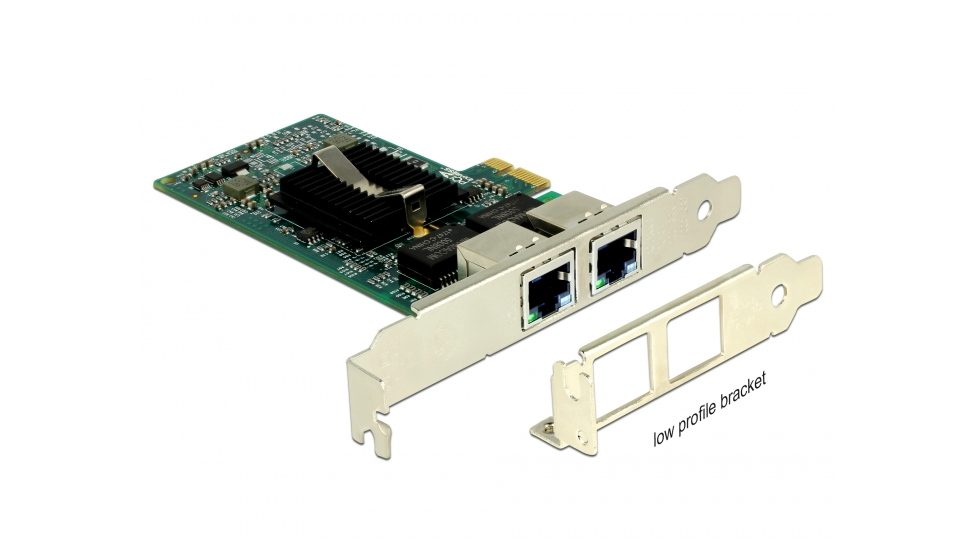 A Delock PCI Express-kártya két hálózati portot biztosít max. 1000 Mbps adatátviteli sebességgel.