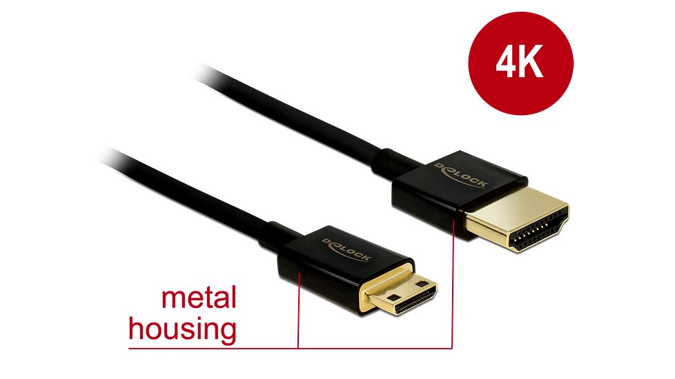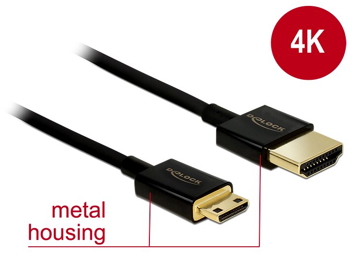 Ez az első osztályú, nagysebességű, Ethernet-kábellel rendelkező, Delock gyártmányú HDMI lehetővé teszi, hogy egy Mini HDMI-csatolóval ellátott kamerát vagy táblagépet és egy HDMI-A-porttal ellátott monitort vagy tévét csatlakoztasson. A vékony átmérőjének és rövid csatlakozóinak köszönhetően kitűnik a tőbbi termék közül. A háromszorosan árnyékolt kábel gyors adatátvitelt, illetve hang-/video- és Ethernet-csatlakozást biztosít. A maximum 18 Gb/s sávszélességnek köszönhetően mostantól lejátszható a 4K tartalom (max. 60 Hz-es képváltási sebességgel), a 4K felbontású 3D-tartalom (max. 24 Hz-es képváltási sebességgel) és a 21:9 (mozi) képarányú tartalom. A kábel segítségével két videocsatorna egyidejűleg továbbítható, hogy két felhasználó tudjon egy képernyőn videostreameket megjeleníteni, ezenkívül akár négy hangcsatorna is egyidejűleg továbbítható. A hangátvitel minősége a max. 1536 kHz-es mintavételezési frekvenciával jelentős mértékben javult.
