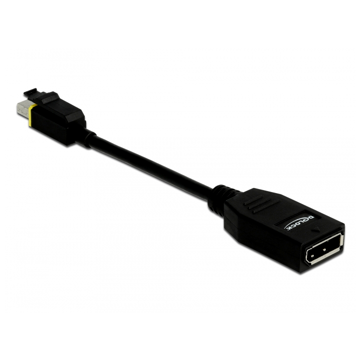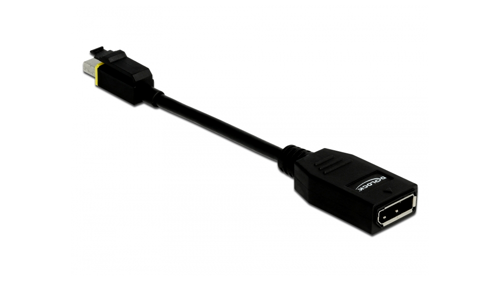 Ez a Delock mini DisplayPort adapter használható egy DisplayPort képernyő olyan grafikai kártyákhoz történő kapcsolására, melyek mini DisplayPort csatlakozási felületük felett egy speciális bemélyedés van. Az adapteren csatlakozási felületén lévő tolózár ebbe a bemélyedésbe kapcsolódik, és így megvédi az adapter véletlenszerű szétkapcsolódástól.