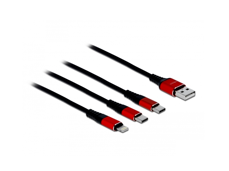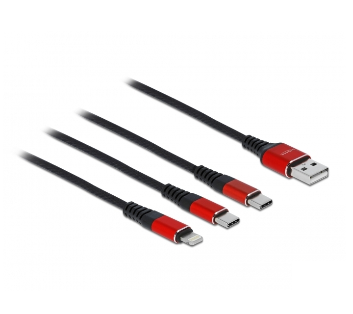 Ez a Delock 3 az 1-ben töltőkábel különféle eszközök, például Lightning™ vagy USB Type-C™ interfésszel ellátott táblagépek vagy okostelefonok töltésére használható USB áramforráson keresztül.