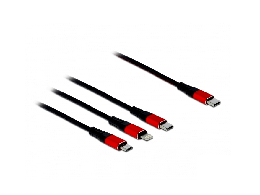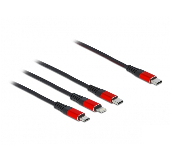 Ez a Delock 3 az 1-ben töltőkábel különböző eszközök töltésére használható, például táblagépek vagy okostelefonok Lightning™, Micro USB-B vagy USB Type-C™ interfésszel USB áramforráson keresztül.