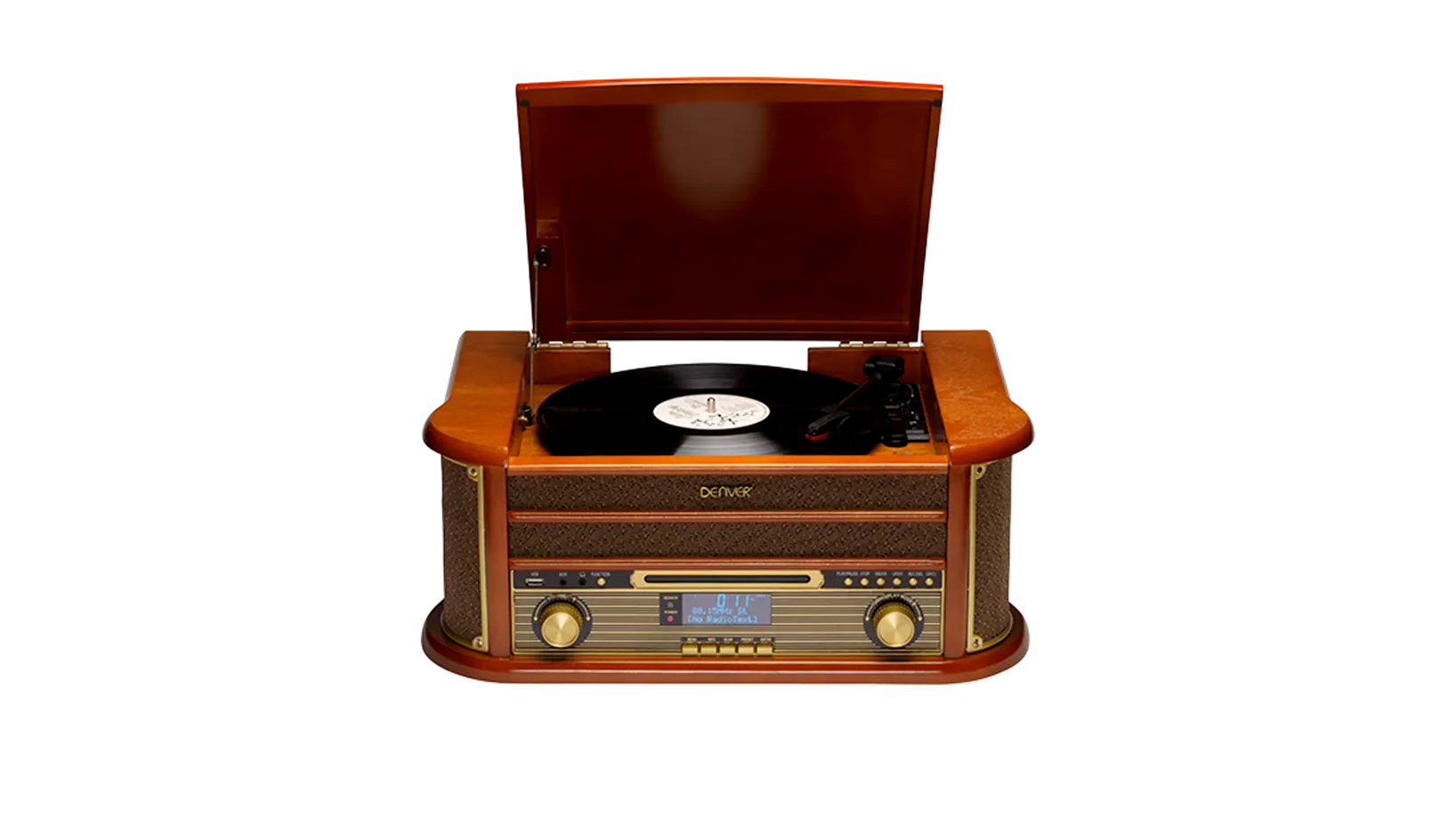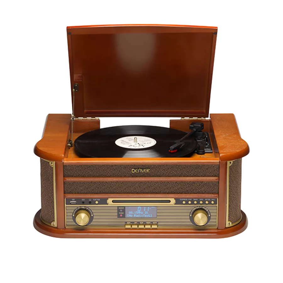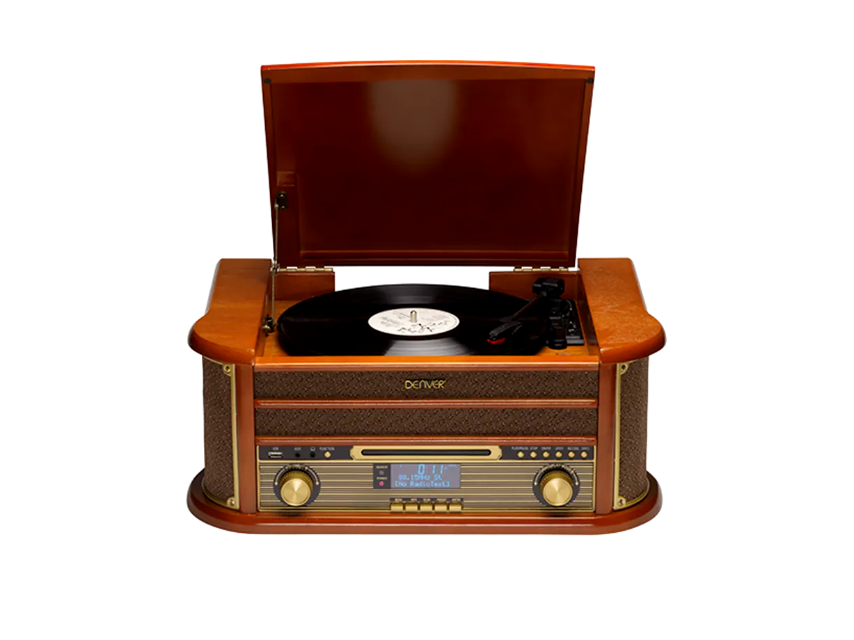- Fából készült retro zenei központ lemezjátszóval (3 sebességes 33-1/3, 45 78 RPM)