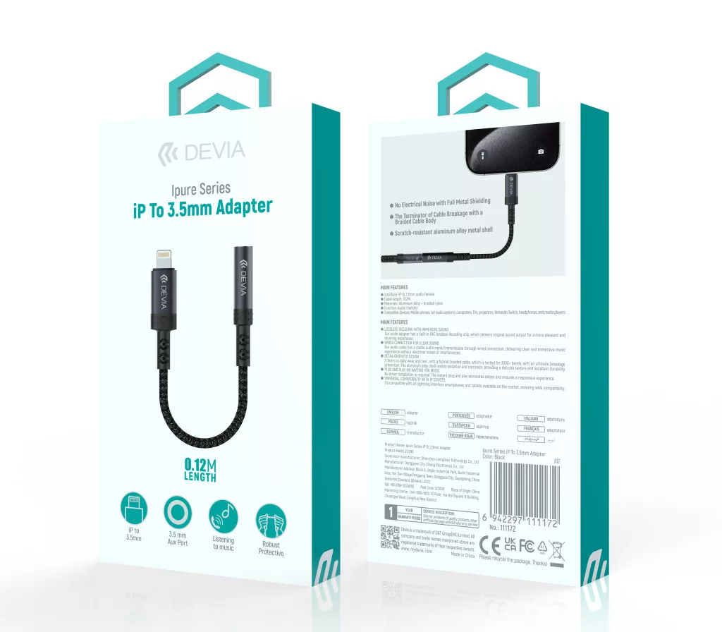 Tapasztalja meg a Devia iPure Series adapter nyújtotta professzionális hangátvitelt és kivételes tartósságot. Az adapter tökéletes választás, ha iPhone készülékét szeretné csatlakoztatni hagyományos 3,5 mm-es jack csatlakozóval rendelkező audió eszközökhöz.