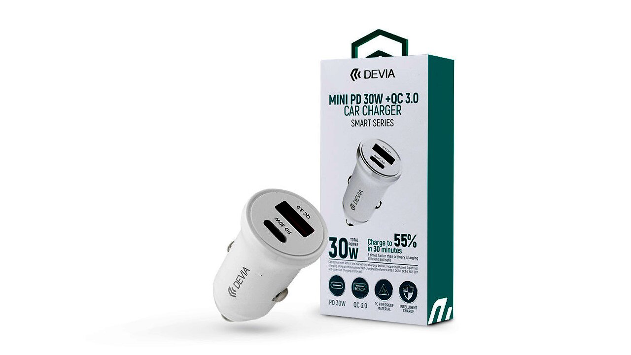 A Devia Smart Series Mini USB-C / USB-C Szivargyújtós Töltő Adapter 30W fekete színben az autós töltők új generációja, mely gyors és hatékony töltést biztosít minden kompatibilis eszköz számára, legyen az okostelefon, tablet vagy bármilyen más elektronikus készülék.