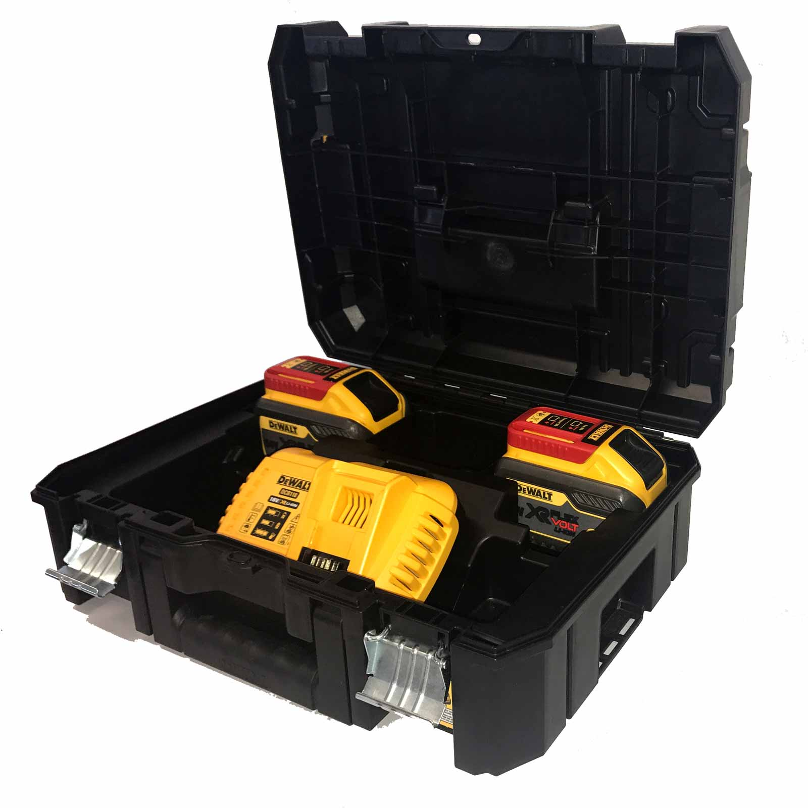 DCB118 rendszertöltő és két XR FLEXVOLT DCB548 akkumulátor a készlet tartalma.