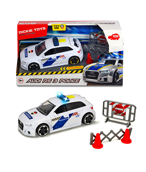 Dickie Audi RS3 magyar feliratos rendőrautó. Ez a járgány az autópályák leggyorsabbja, ha riasztás érkezik, azonnal a baleset helyszínére siet és a gyorshajtókat is hamar elkapja. A játék gombnyomásra hangot ad ki és világít.