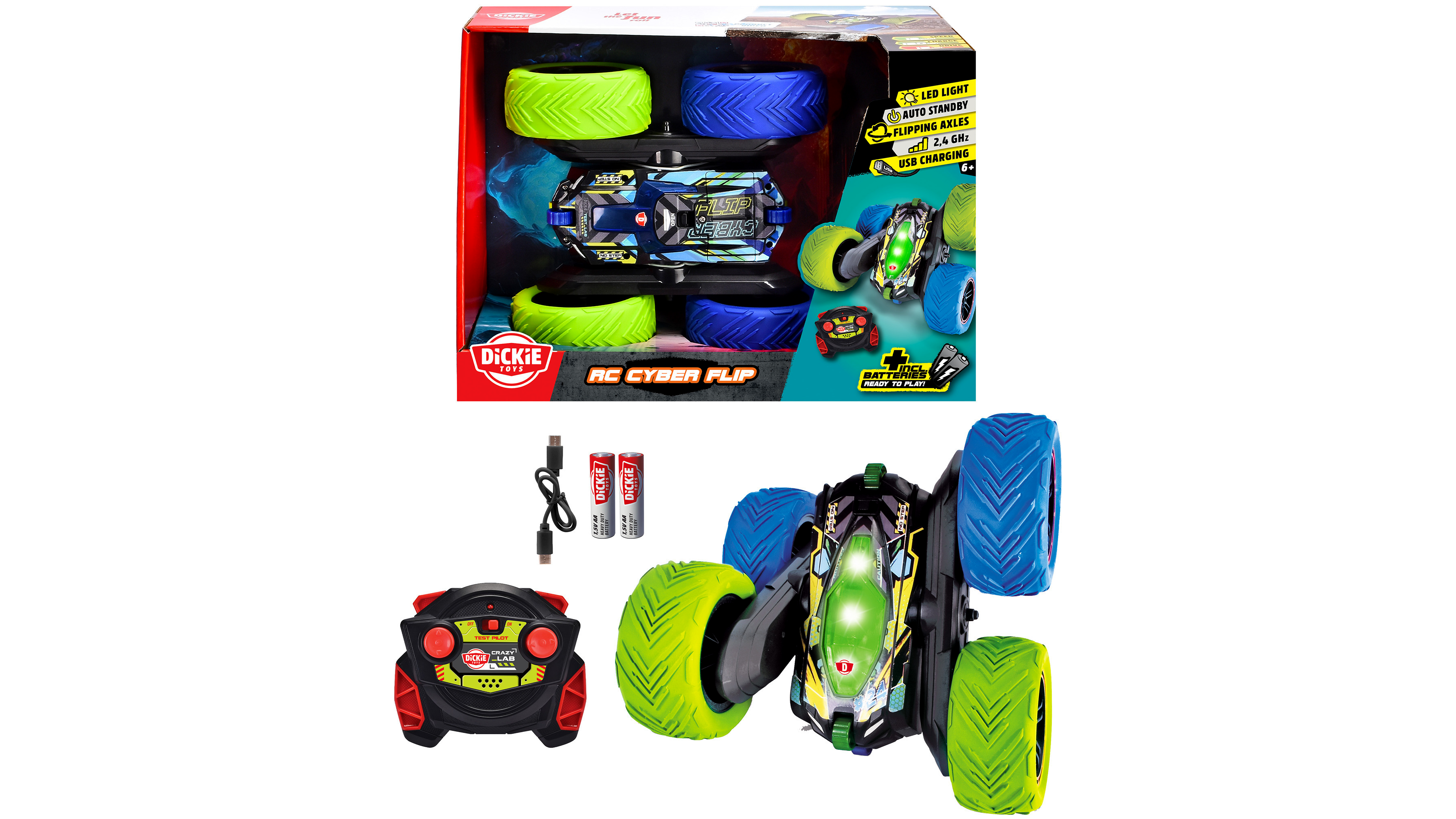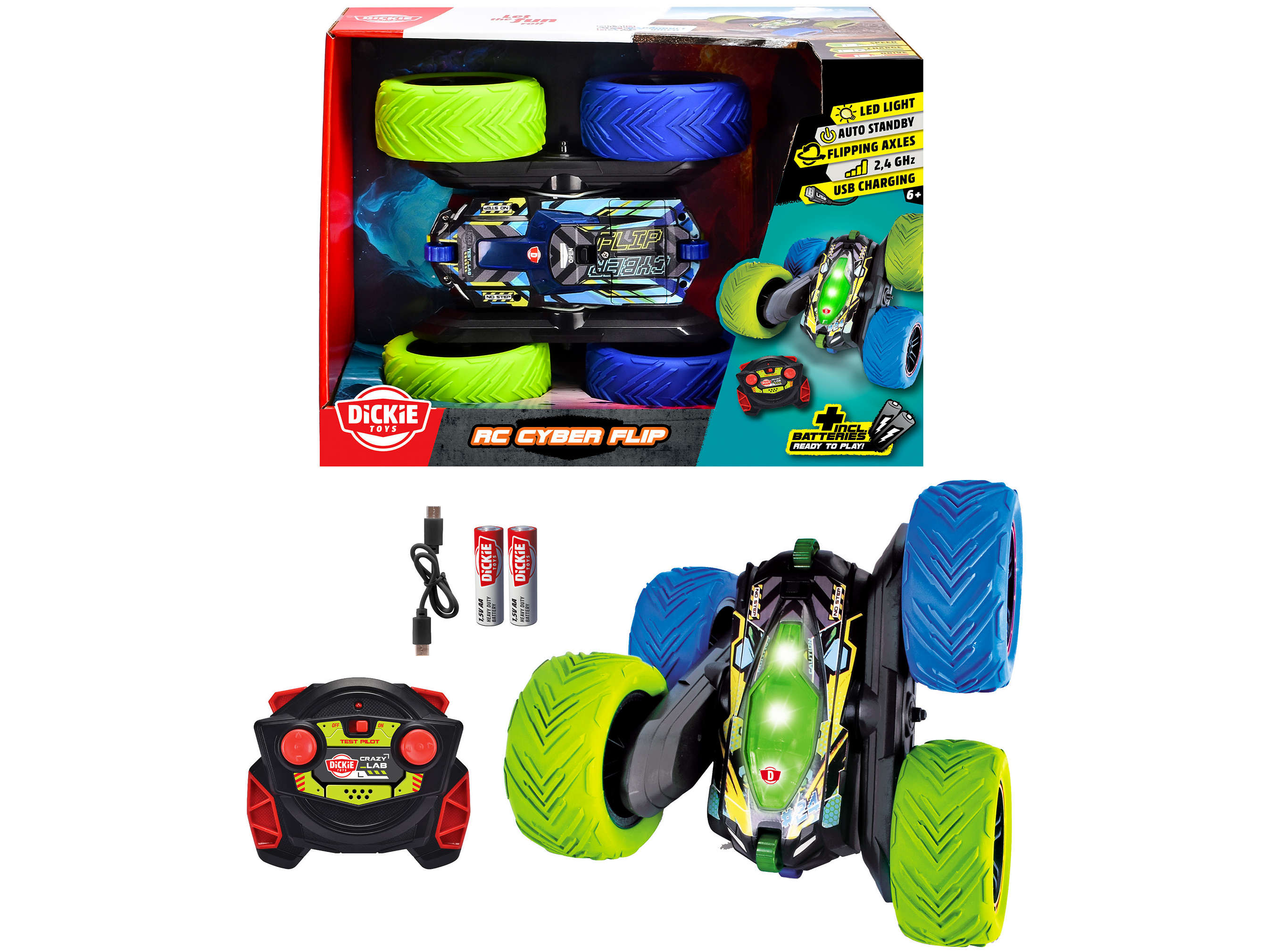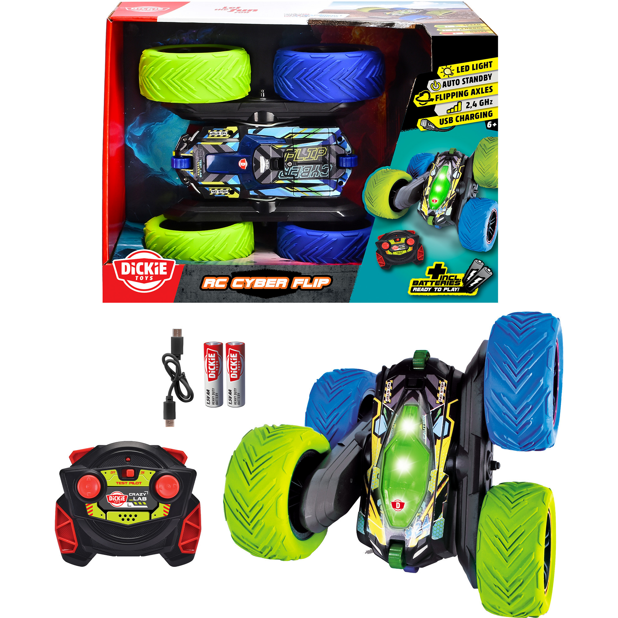 A Dickie Toys RC Cyber Flip nem csak teljesítményével tűnik ki, hanem futurisztikus dizájnjával is. A kék és zöld színváltás még látványosabbá teszi a járművet, különösen a beépített LED lámpák segítségével.