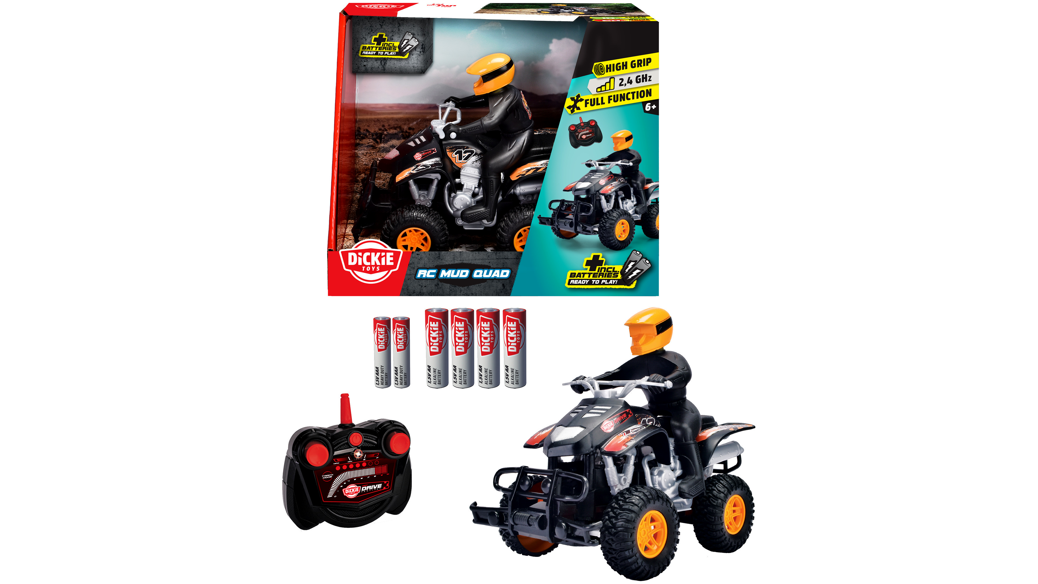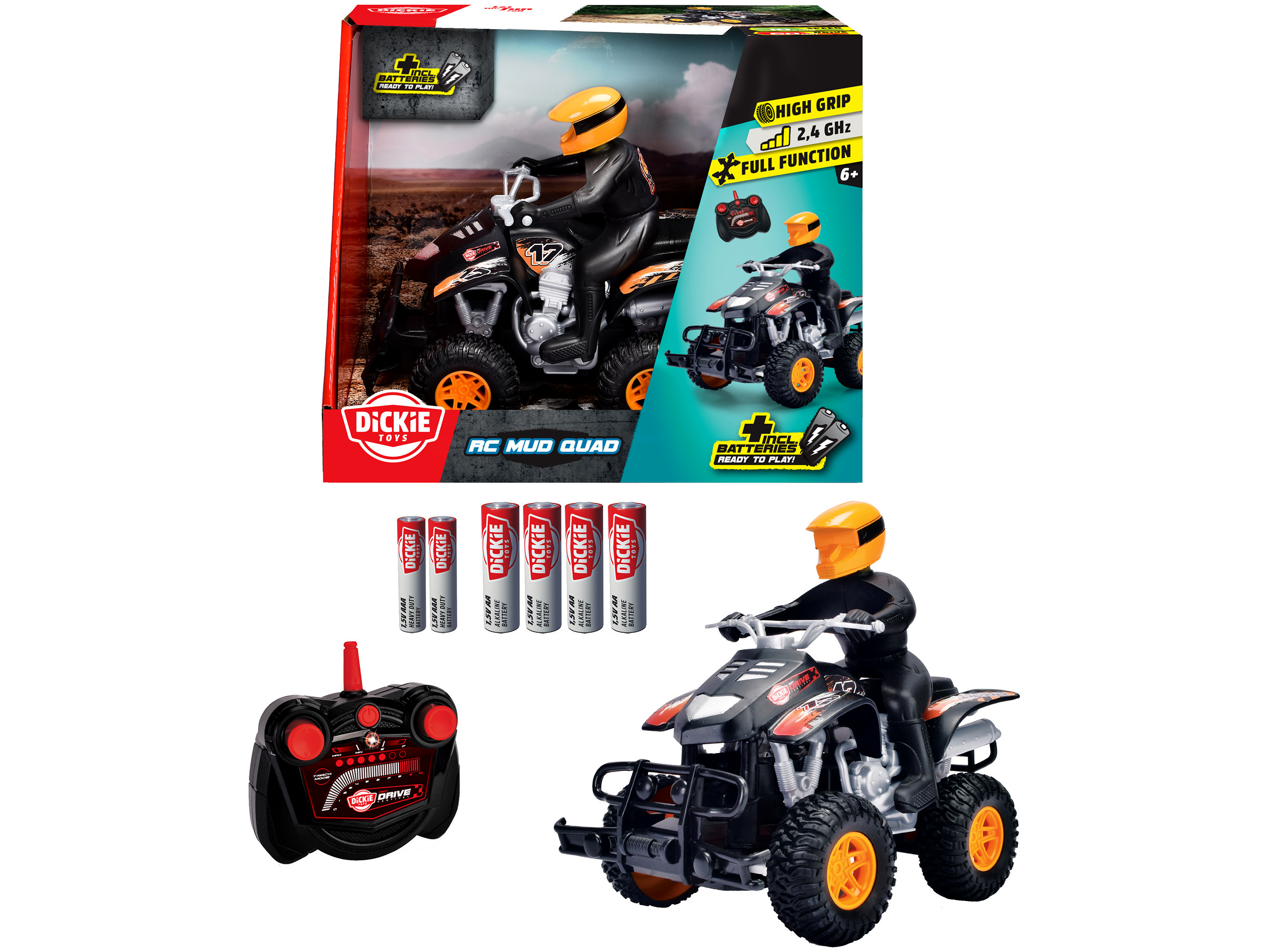 A Dickie Toys távirányítós quad sofőrrel látványos terepjáró élményt kínál a gyerekeknek, legyen szó szobai versenyről vagy kinti kalandról. Robusztus felépítésének, széles lökhárítójának és tapadós gumigumijainak köszönhetően magabiztosan halad különböző felületeken, miközben a fixen rögzített vezetőfigura még játékosabbá teszi a terepezést.