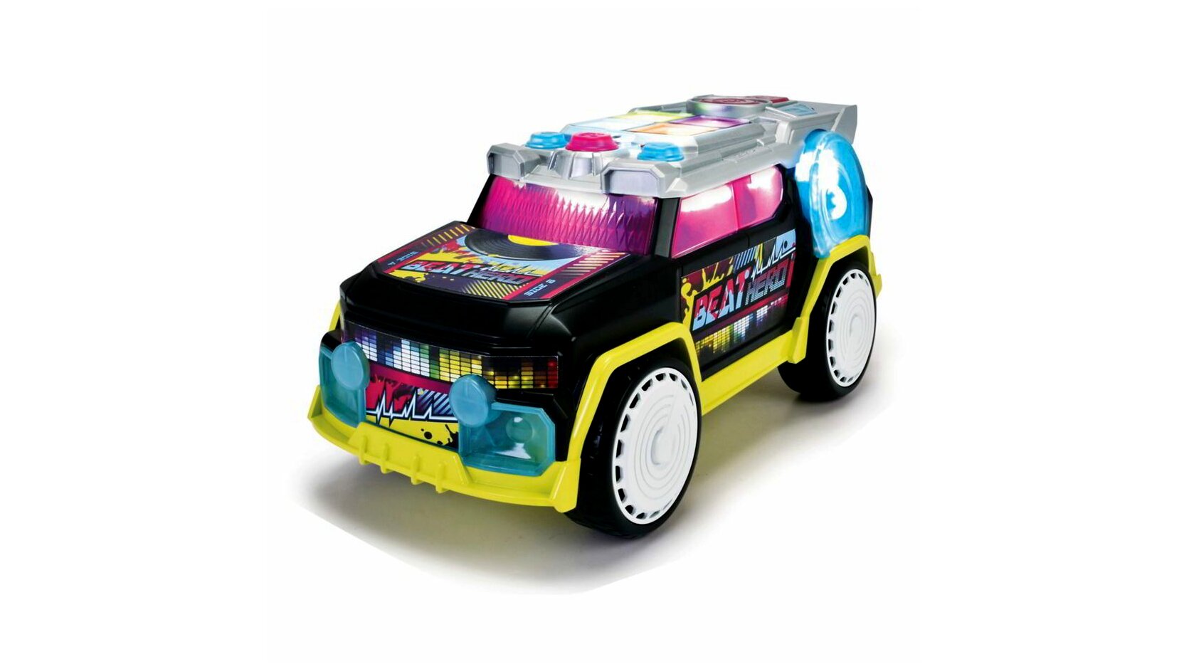 A Dickie Toys Beat Hero az autók és a zene világának tökéletes találkozása! Ez a fantasztikus játékautó egy integrált DJ pultra épülő fényshow-val kombinálva minden gyermek és felnőtt zenekedvelő álma, akik imádják az autókat. Az autó mérete lenyűgöző: 33,5 cm hosszú, 15,5 cm széles és 16 cm magas, így azonnal kitűnik a játékkészletből.