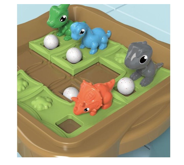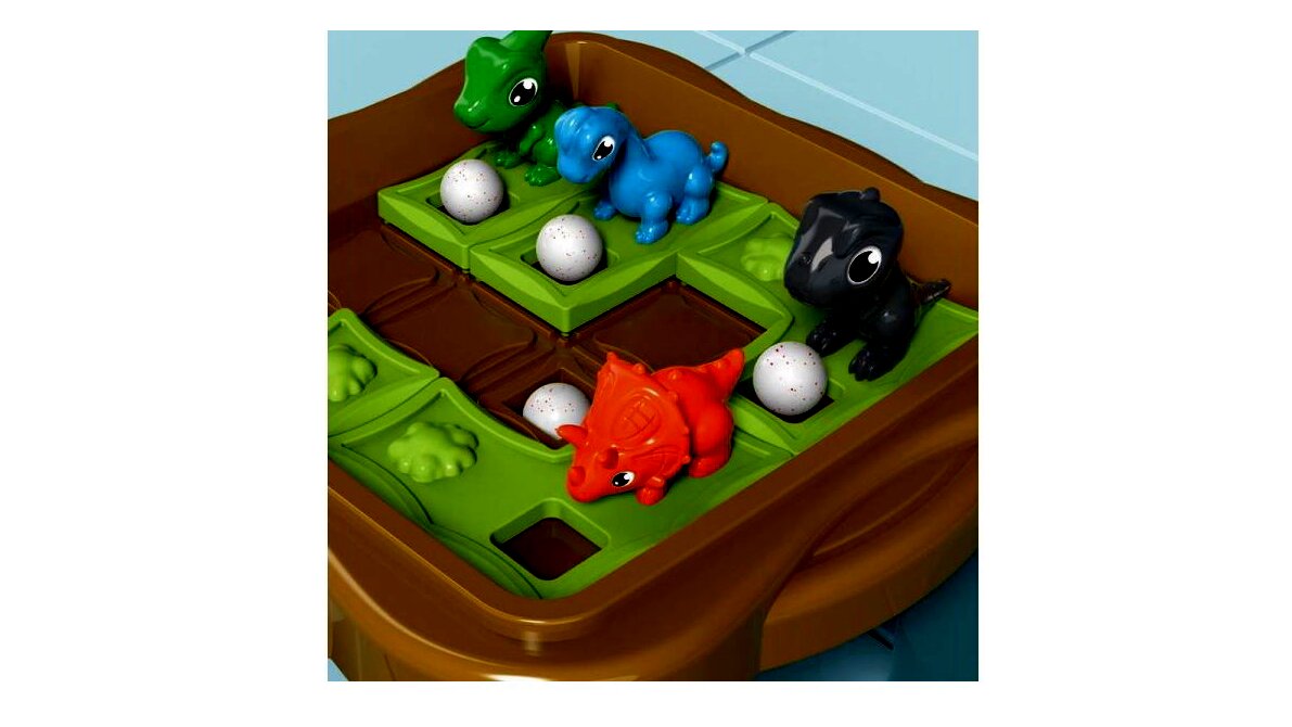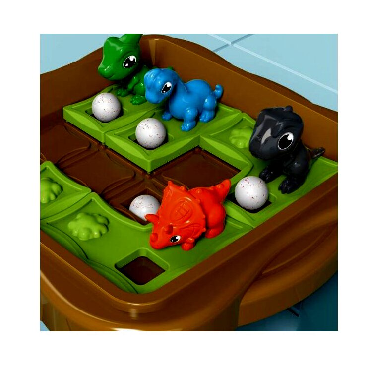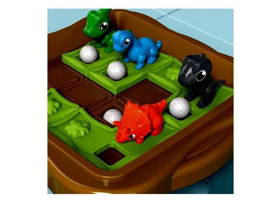 Tartalom: 1 db játéktábla, 4 db táblán tologatható zöld mező (2 kisebb, 2 nagyobb), 4 db dinófigura, 5 db golyó.