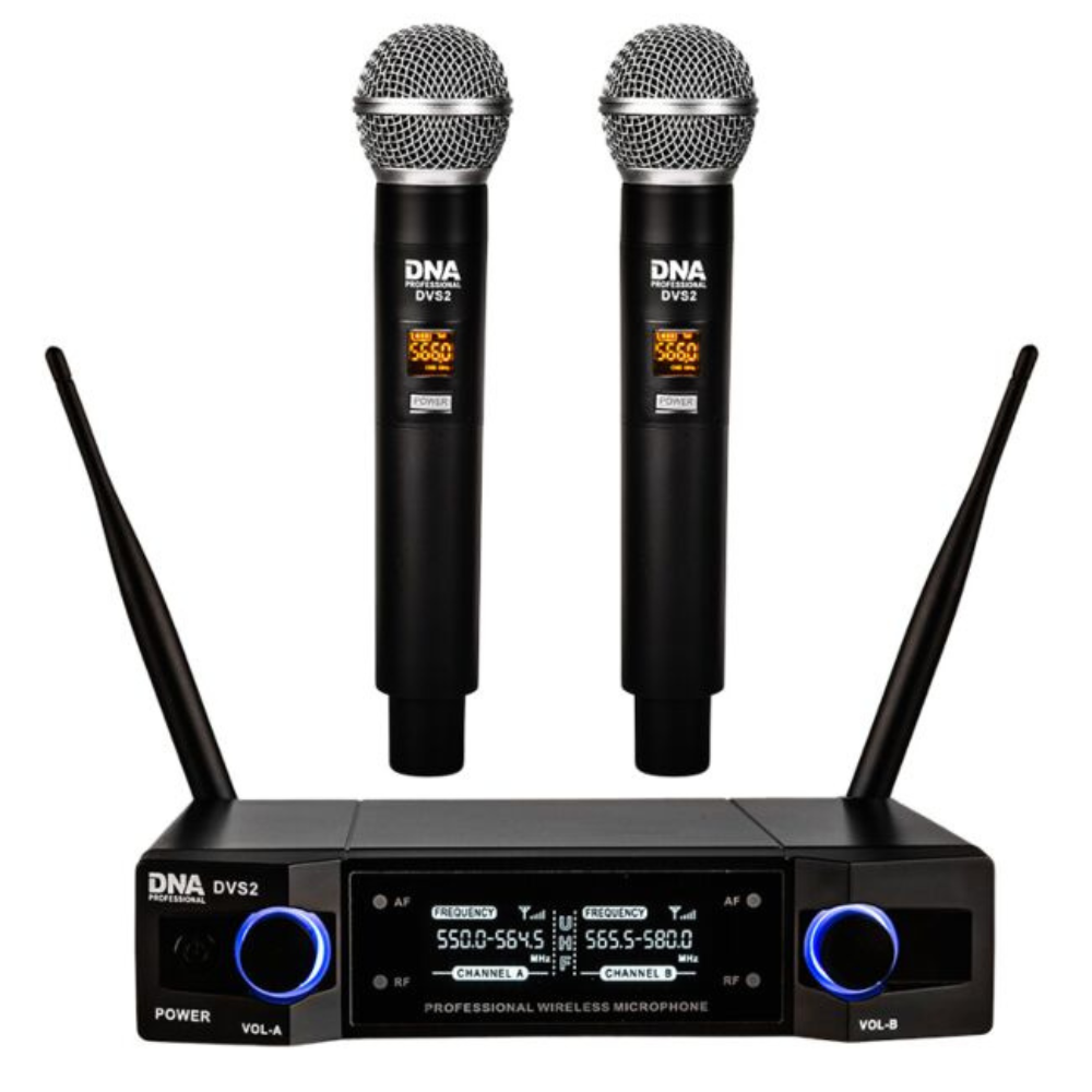 A DNA PROFESSIONAL DVS2 vezeték nélküli mikrofonrendszer kiváló megoldás énekeseknek, zenekaroknak, kórusoknak, műsorvezetőknek, konferenciák és tréningek előadóinak, illetve karaoke rajongóknak. A készlet két kézi adót (kézimikrofont) és egy kompakt, színes LCD kijelzős UHF vevőegységet tartalmaz, stabil, tiszta és zajmentes hangátvitellel akár 50 méteres hatótávolságig.