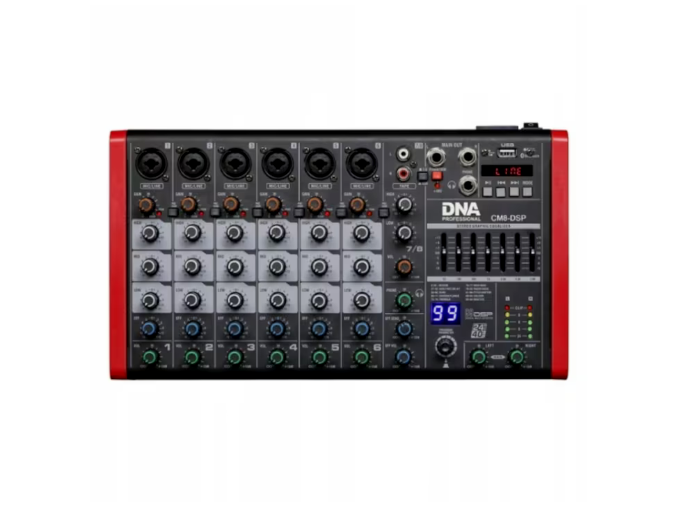 A 8 csatornás felépítés (6 monó + 1 sztereó csatorna) elegendő bemenetet biztosít egy kisebb zenekar vagy DJ setup számára. A monó csatornák XLR / 6,3 mm jack kombinált aljzatot kaptak, így dinamikus vagy kondenzátor mikrofonok, hangszerek, vonalszintű jelforrások egyaránt könnyedén csatlakoztathatók. A sztereó csatorna RCA (cinch) bemenete kiválóan használható lejátszók, médialejátszók, laptopok számára.