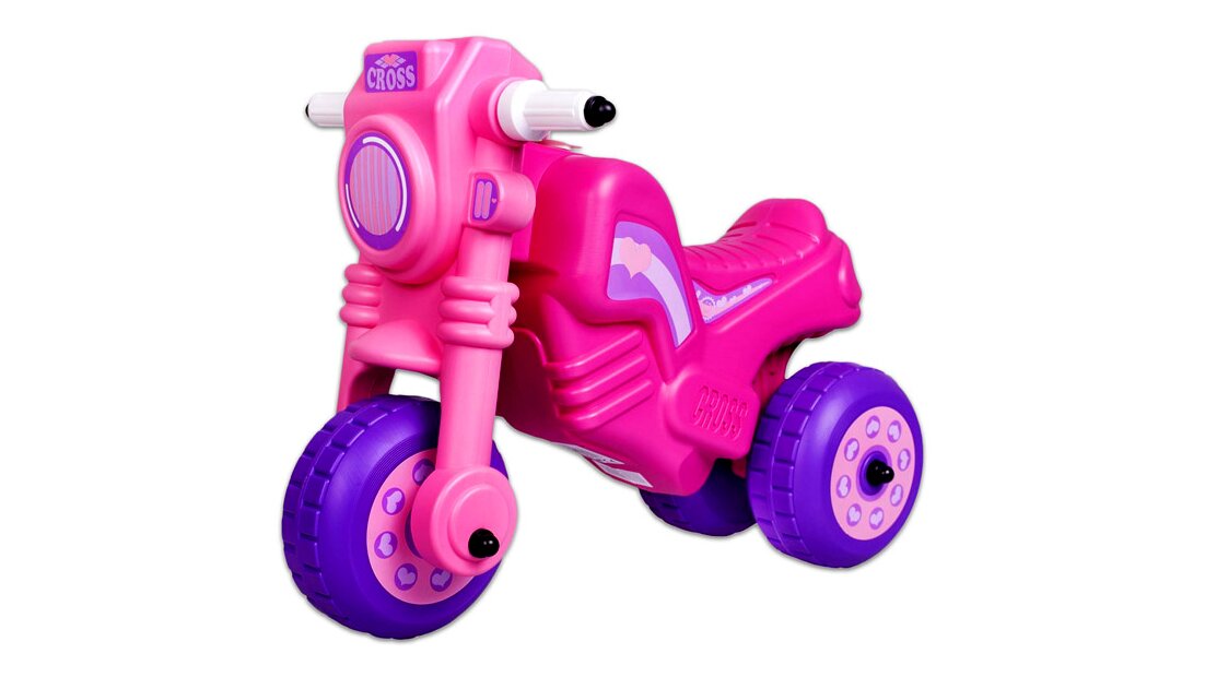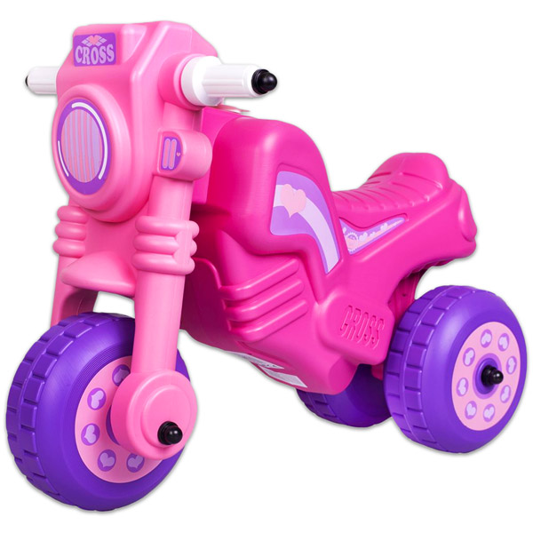 Vagány, egyszerű felépítésű, műanyagból készült pink lábbal hajtós kismotor.