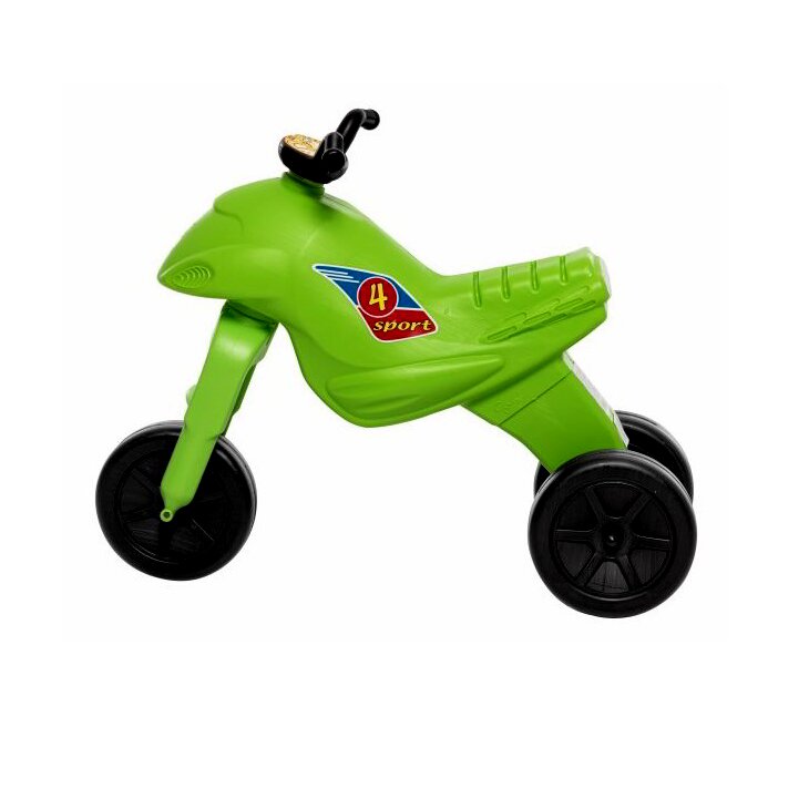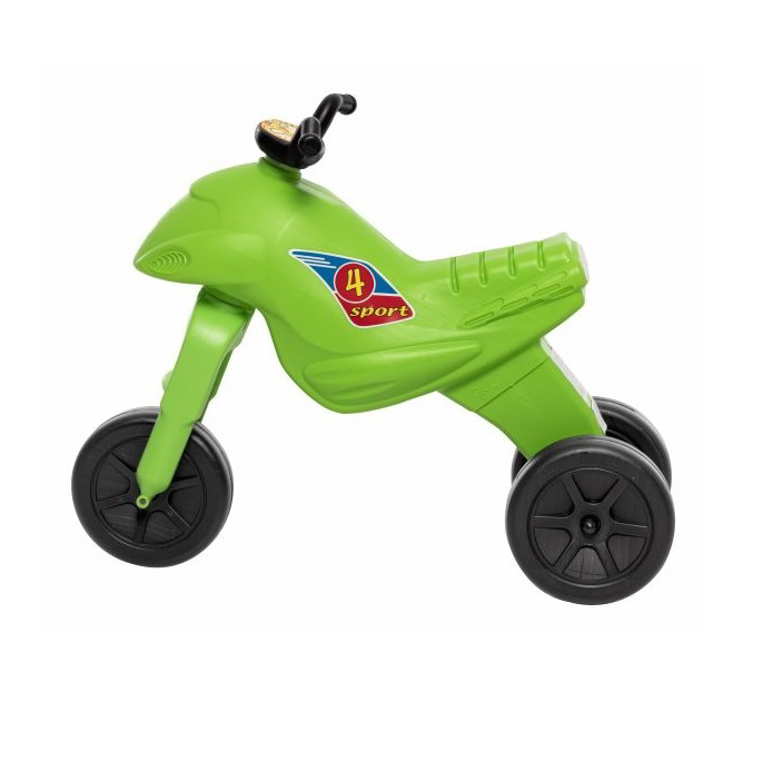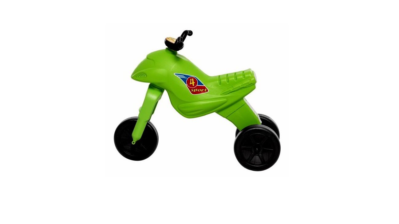 Vagány, egyszerű felépítésű, lábbal hajtós Superbike maxi kismotor, világoszöld színben. A motor műanyagból készült, matricákkal van díszítve. Első kereke kormányozható. Méretek: 60 x 28 x 48 cm.