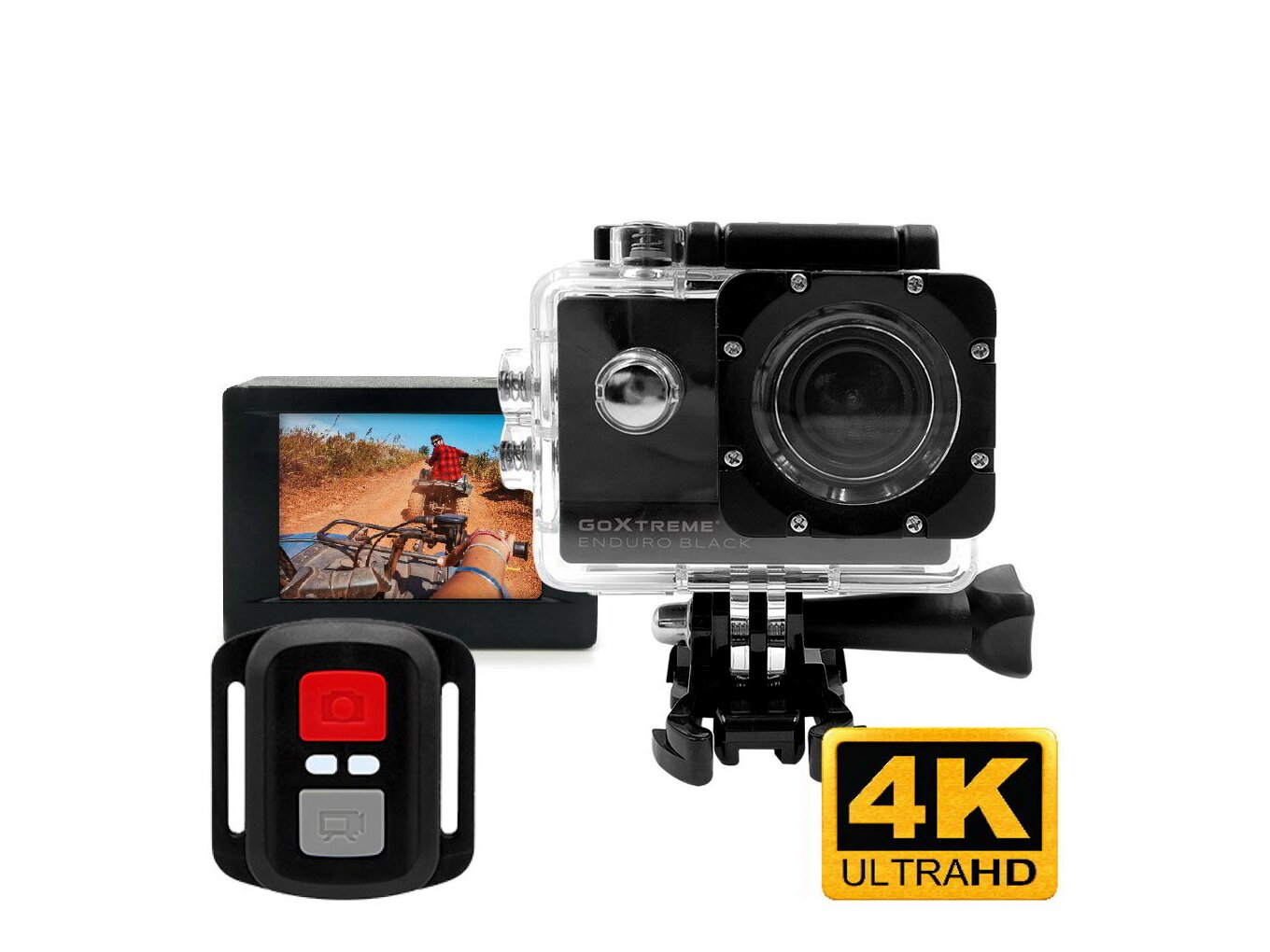 Kompakt méretének és erős, vízálló tokjának hála, amely ellenáll a nedvességnek, a pornak és a kosznak, a GoXtreme Enduro Black kamerát aggodalmak nélkül bárhová magaddal viheted. Akár vízen, akár a víz alatt, akár biciklin vagy snowboardon is légy, a GoXtreme Enduro Black kamerával a felvételek HD minőségben készíthetőek, ami annyit tesz, hogy a legjobb pillanataidat csodás, nagy felbontásban lesznek rögzítve. És mivel mindennel rendelkezik, amire szükséged lehet ahhoz, hogy rögzítsd a tökéletes pillanatokat, ideális outdoor társaddá válik. Egyszerűen rögzítsd a kamerát a mellékelt tartók segítségével a kormányhoz vagy a sisakra, és figyeld a történéseket a beépített 2.0-ás kijelzőn. Búvárkodni mész? Nem probléma. A vízálló tok biztonságban és szárazon tartja kamerádat egészen 30 méter mélységig.