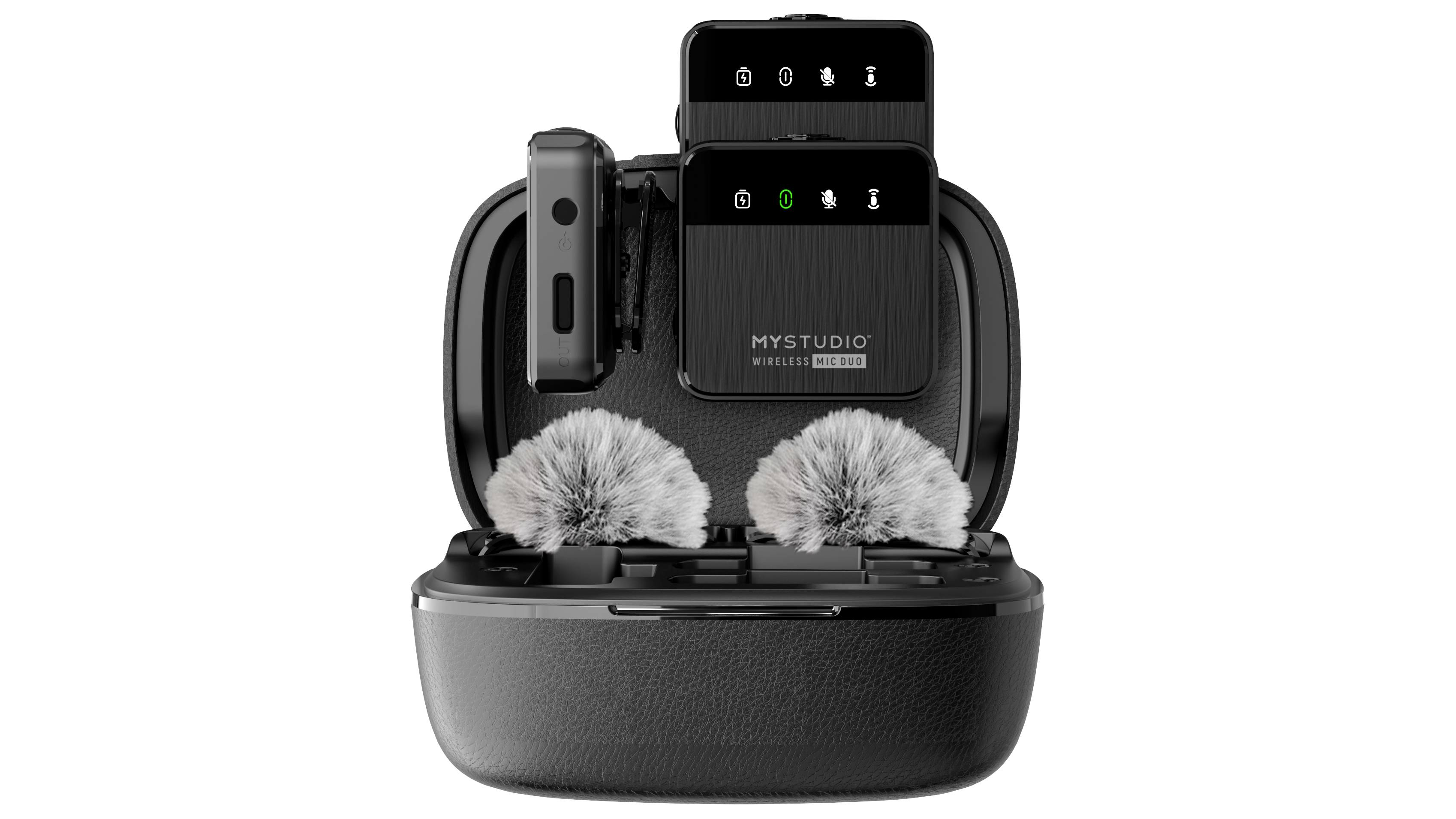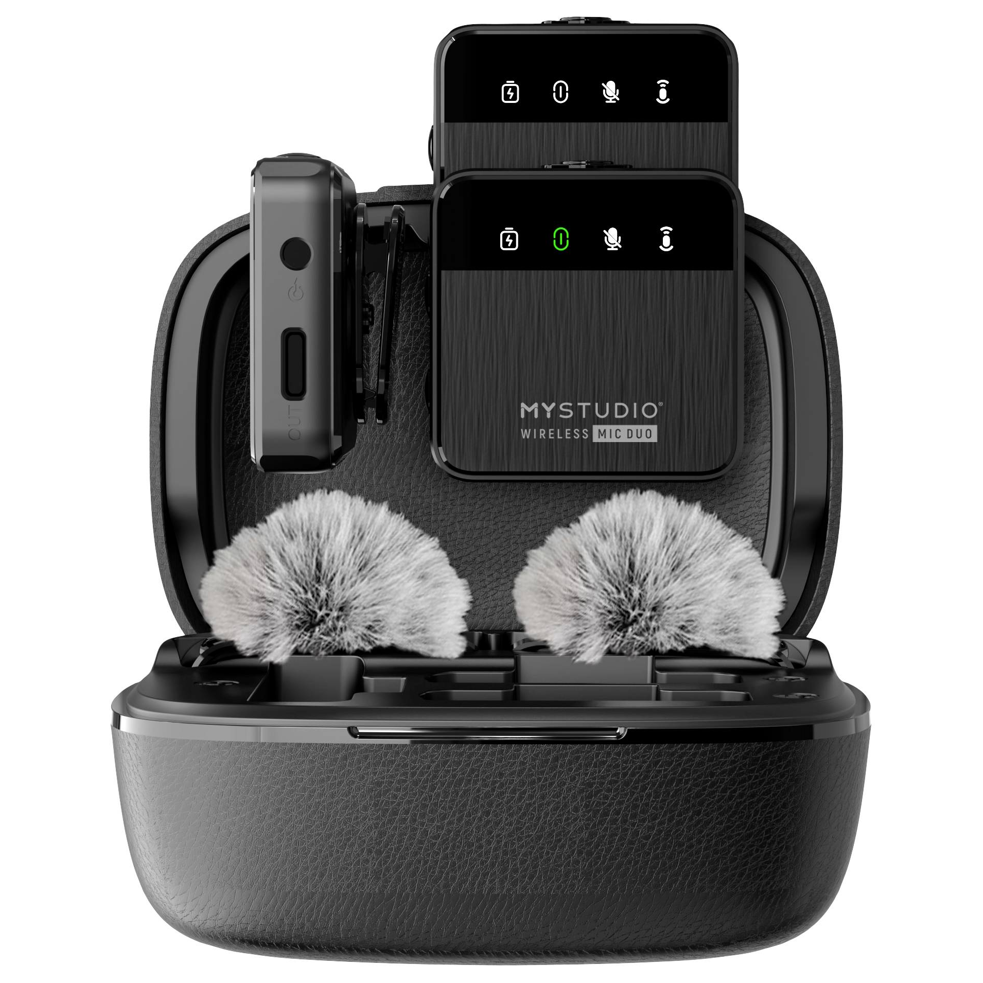 A MyStudio Wireless MIC DUO egy kompakt, rendkívül hordozható és sokoldalú készlet, amely két mikrofonból, egy kétcsatornás vevőegységből és egy töltőtáskából áll.