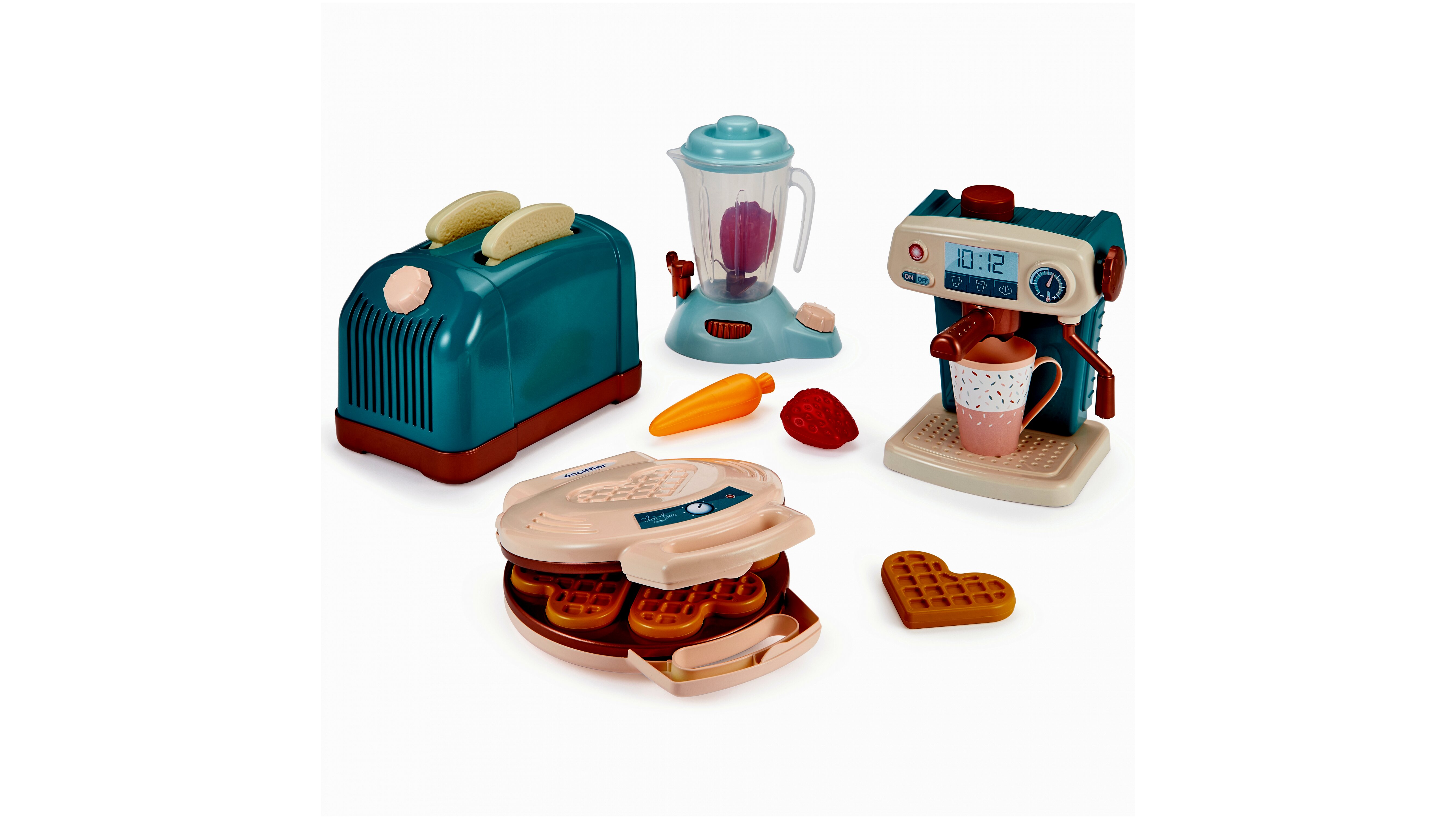 Gofri, egy csésze kávé, pirítós és turmix. Az Écoiffier 4 az 1-ben szettjével a gyerekek ezt mind el is készíthetik, hogy aztán megkínálják plüsseiket, babáikat vagy a szülőket.