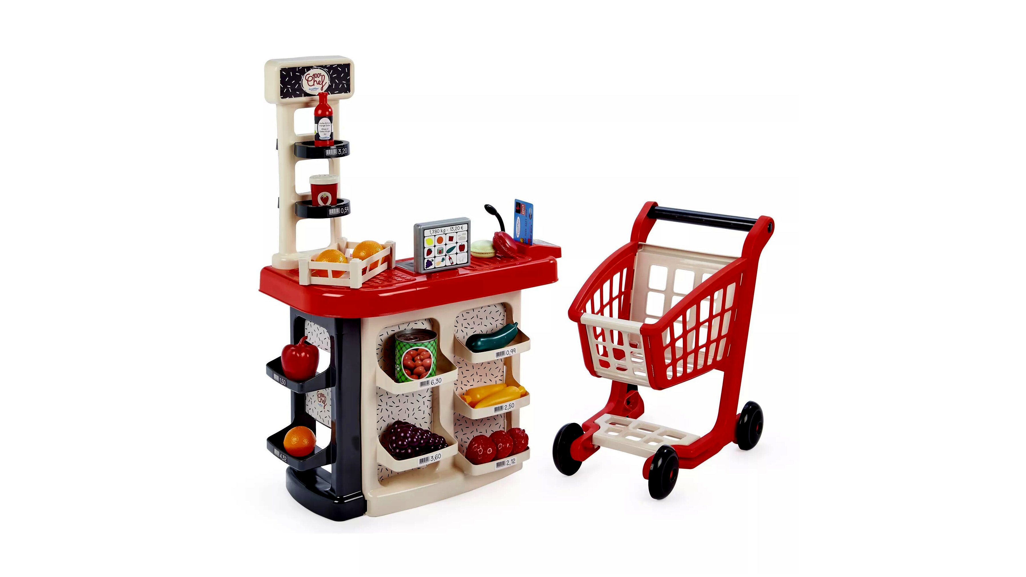 - Valósághű kiegészítők: A csomag tartalmaz bankkártyát, mikrofont és leolvasót, így a gyerekek igazán valósághű bevásárlási élményt élhetnek át.