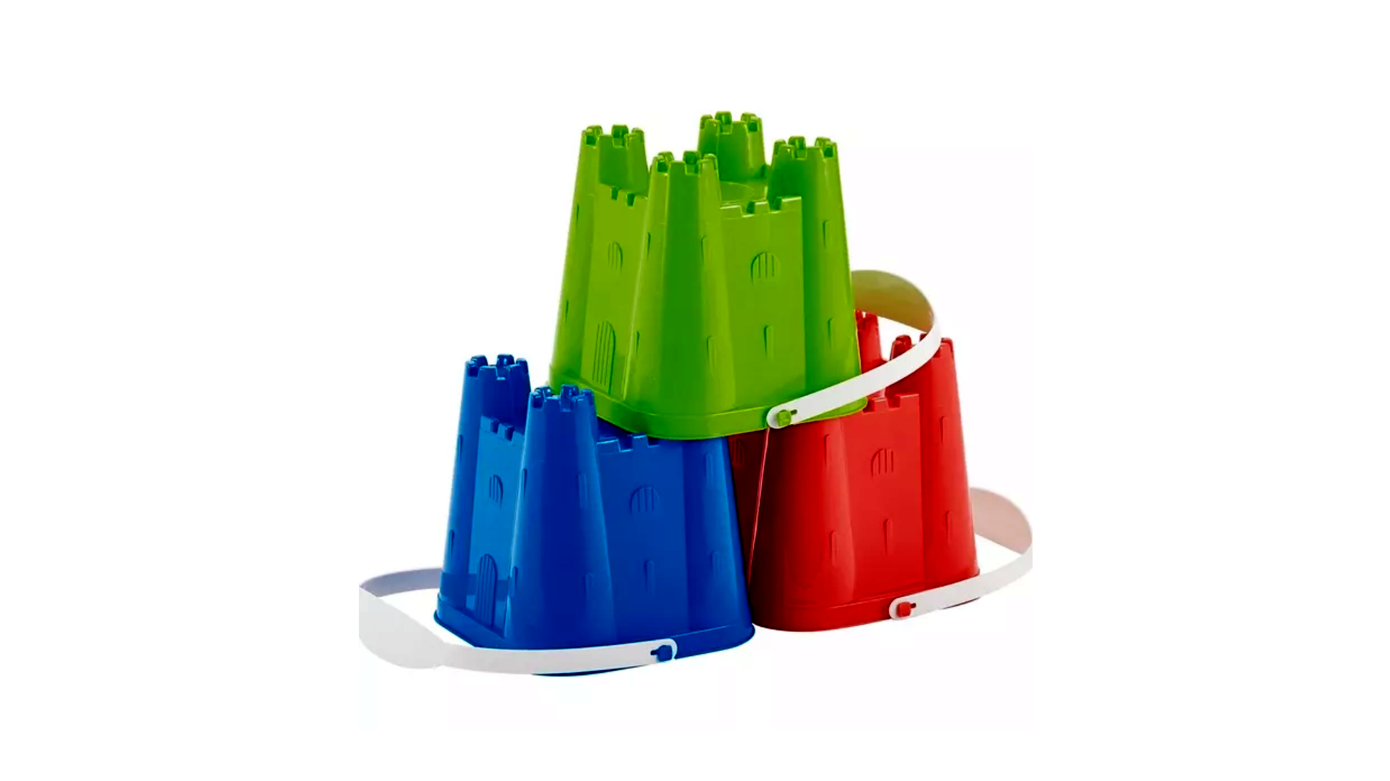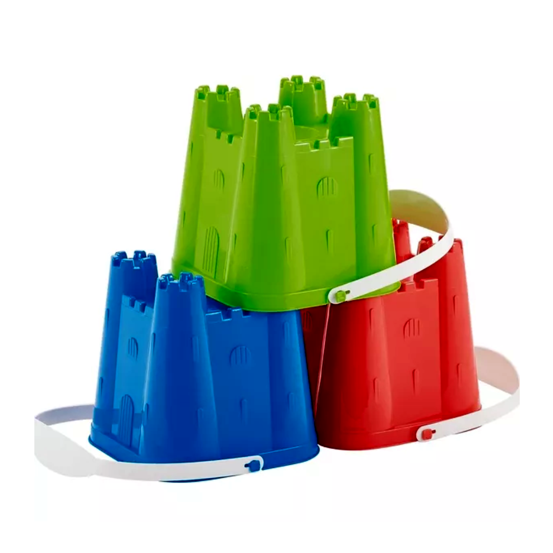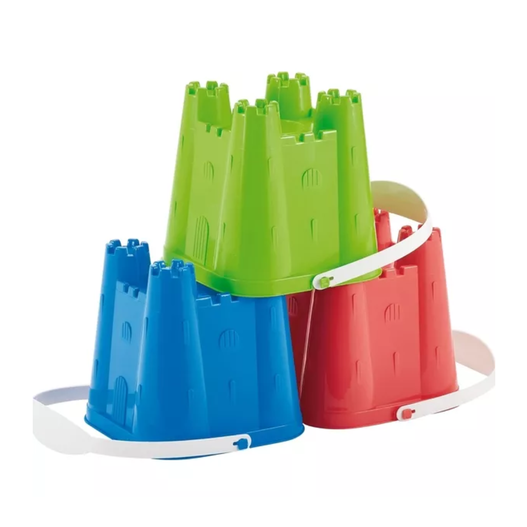 Nagy méretű homokozó vödör piros, kék és zöld színben. A vödörnek vár formája van, így akár pecek alatt elkészülhet a strandon az erőd! Méretek: 15 x 14 x 14 cm.