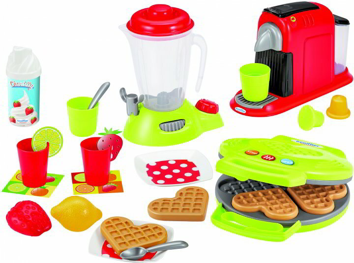 Elérkezett a kis séfek ideje! A 28 részes Écoiffer konyhai kisgép szettel a gyerekek tökéletes játék reggelit készíthetnek az egész családnak. Kávé? Gofri? Smoothy? Jöhet ilyen sorrendben. A szettben a zöld-piros, dizájnos kisgépeken kívül számos kiegészítő is található, hogy igazán izgalmas legyen a játék.